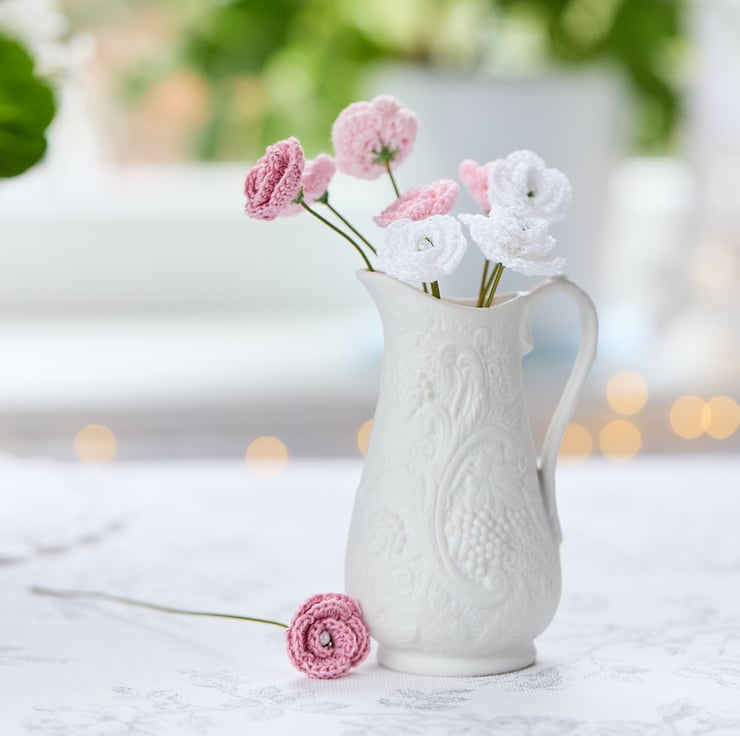 Miniature crochet roses in a variety of colours - a pretty accessory that is full of romantic sentiment. Perfect for seasonal decorative arrangements and adding love touches to your favourite spaces!