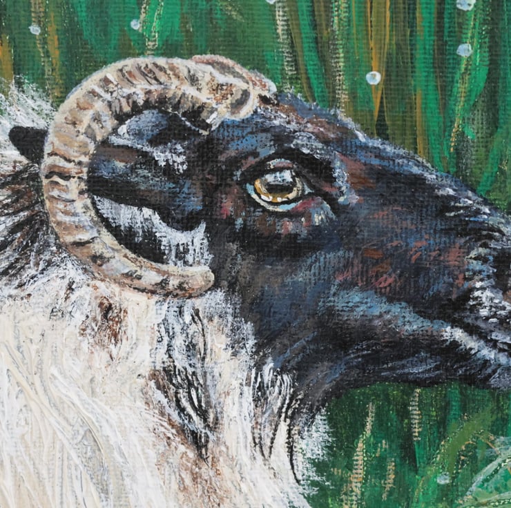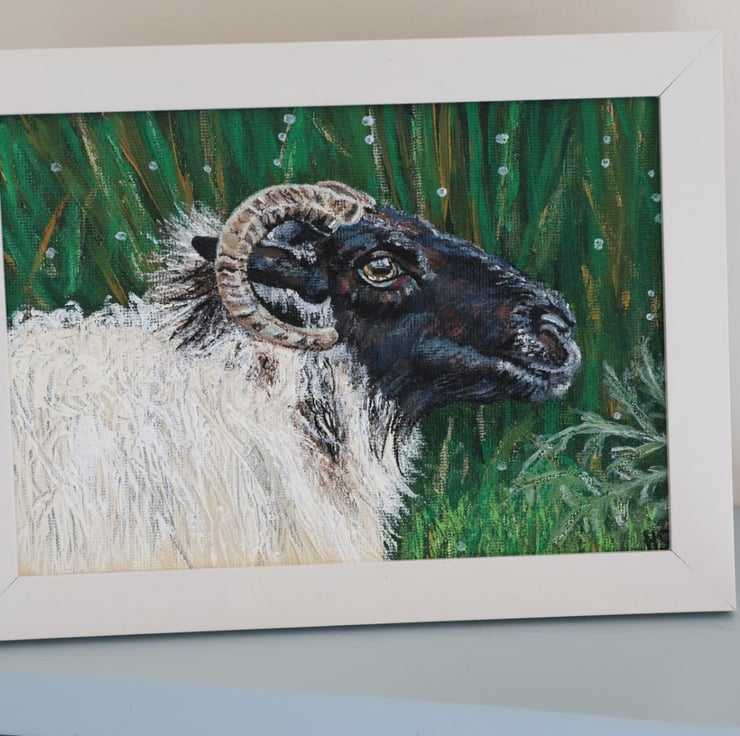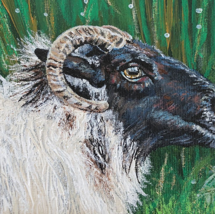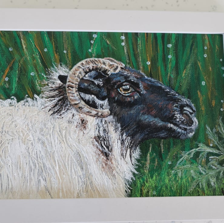 A majestic sheep painted in acrylics on a 7 inch by 5 inch canvas board.
