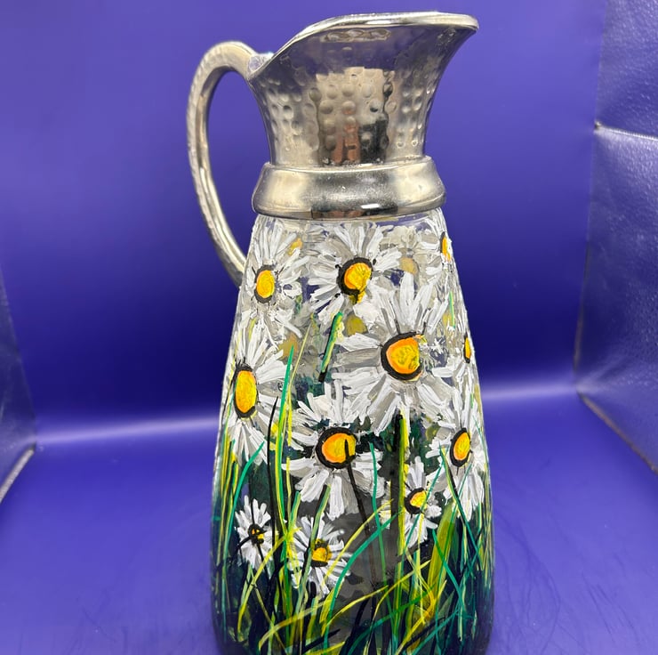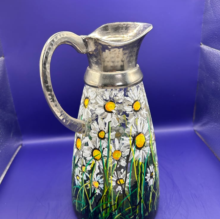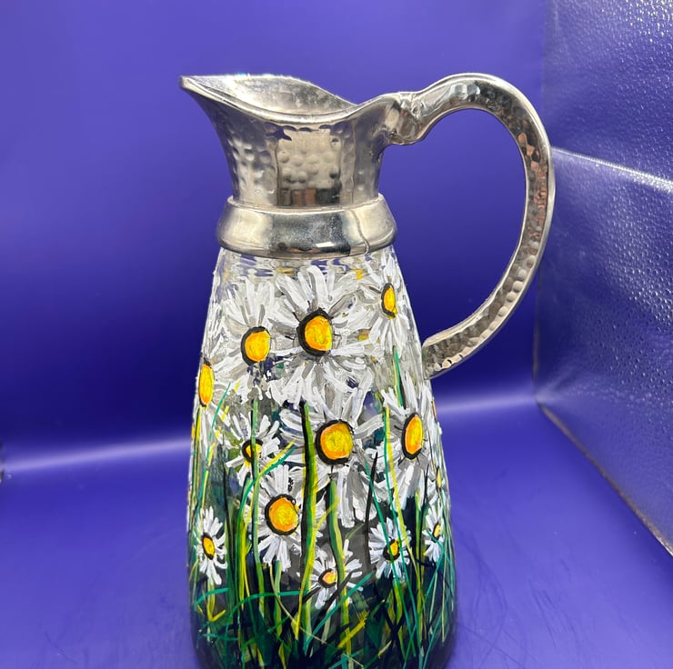 A hand painted and fired glass and metal pitcher by Andrew Jenkins