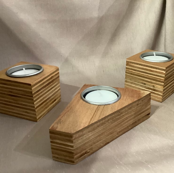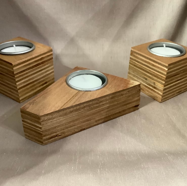 These are unusual hand made, from recycled Plywood, The wood is cut and glued to form the different layers and finished in local beeswax to bring out the different colour layers and a natural look. Different shapes and styles can be done to order so please ask. As all are hand made dimensions are approximate and no 2 will ever be the same. The dimensions for the square are 6x6x6 cm and the angular one is 12x12x9x4 cm. Please contact me if you require anyth8ng different.