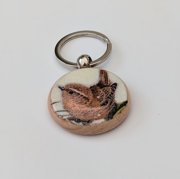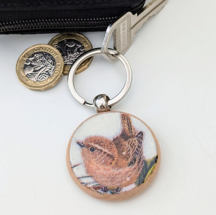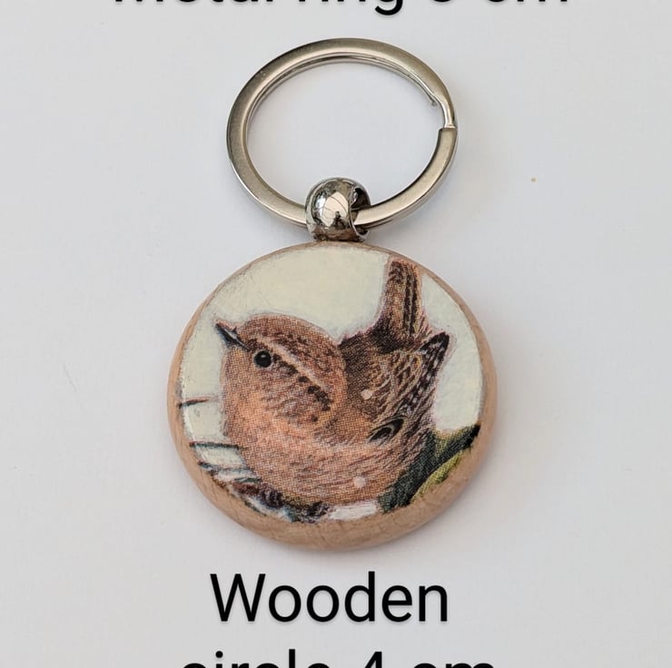 Lovely wooden keyring which is round in shape and features a delightful little Jenny wren which has been decoupaged on the front. The keyring has been varnished for added protection and will be supplied attached to recyclable cardboard packaging with a Crafty Nature label. This cute little wren keyring would make a useful gift or Christmas stocking filler for a bird lover.