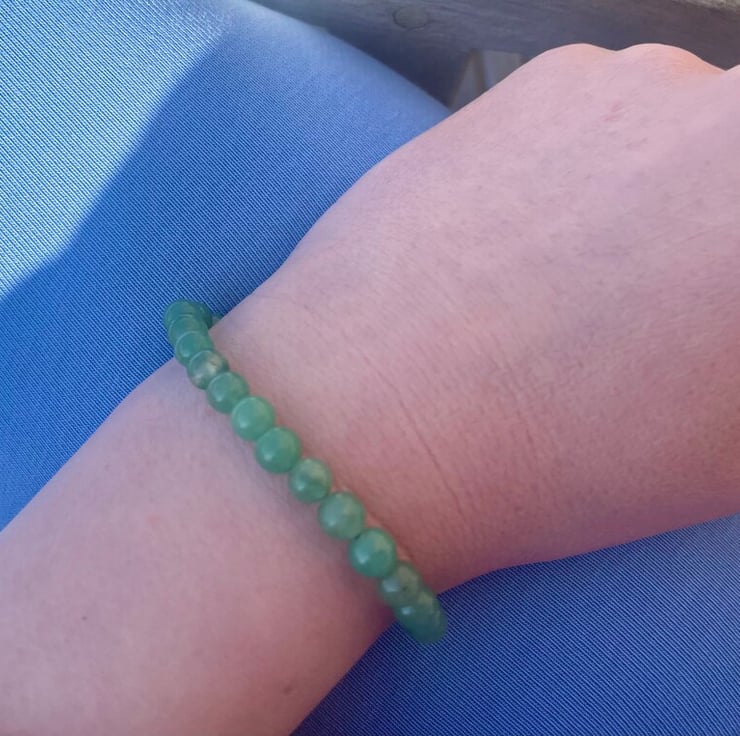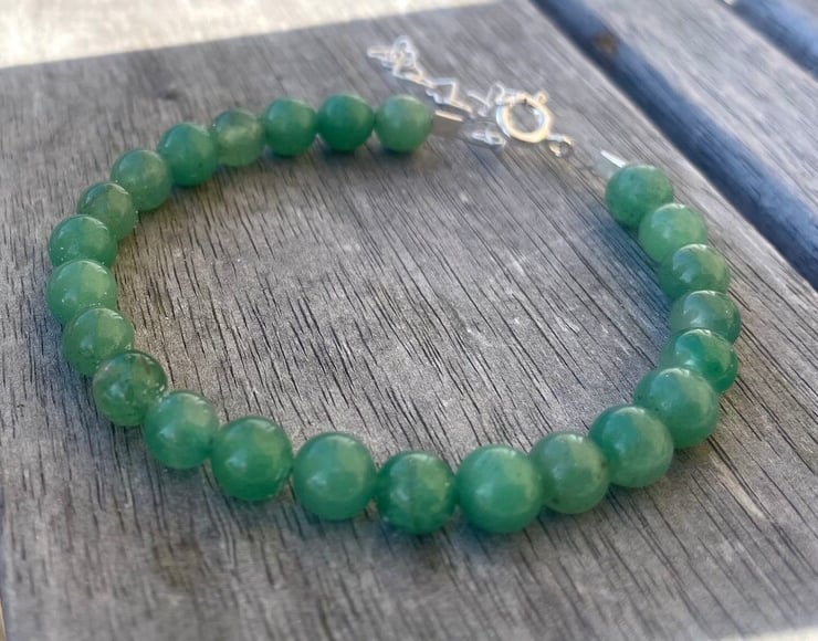 A 6mm grade A aventurine gemstone beaded bracelet. Aventurine is a very pretty shade of green. This bracelet measures 6.5 inches along with an extra 1.5 inch sterling silver heart extension chain, so 8 inches at the largest heart fastening. (will fit older girls and adults.) A very pretty boho bracelet. Free gift pouch. Wear this bracelet along or in a stack with other bracelets. Last two left as a best seller,
