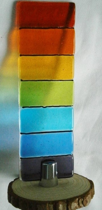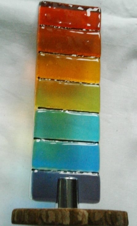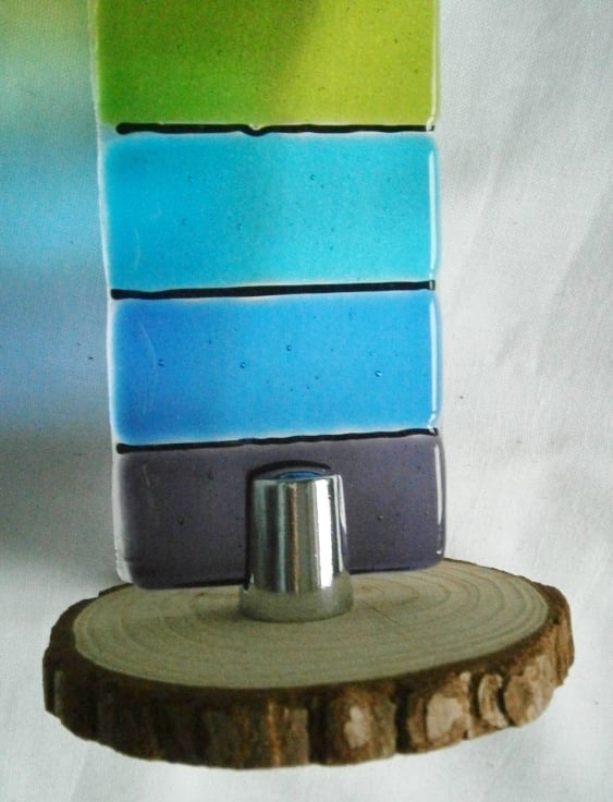 Glass panel measures approx 15.5cm x 5cm and is mounted a round wooden disc.