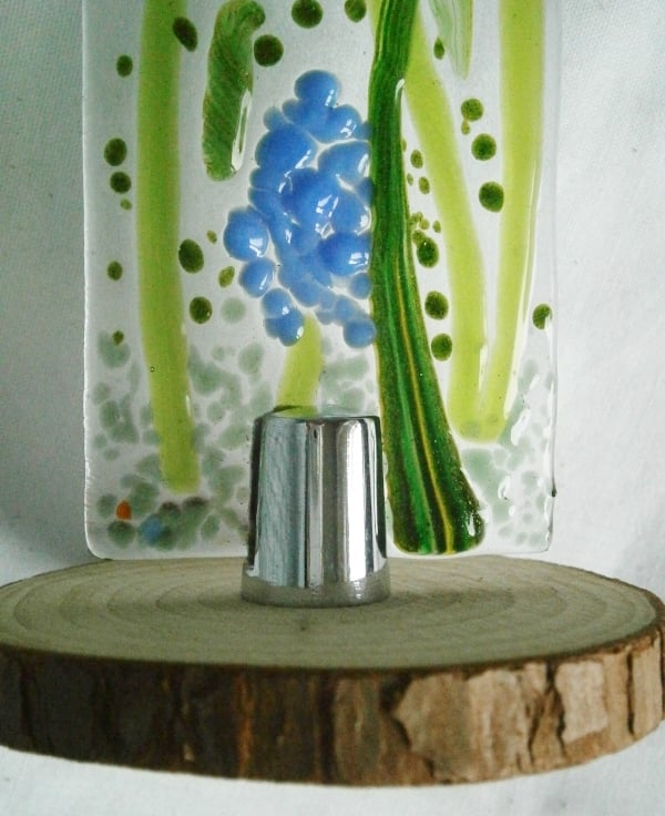 Fused Glass Worry Poppet or Suncatcher with Glass Fused to Resemble Blue Muscari/Grape Hyacinths"Add a touch of calm to your day with this gorgeous fused glass worry poppet or suncatcher! Featuring beautiful blue muscari/grape hyacinths, this stunning piece is sure to lift your spirits.