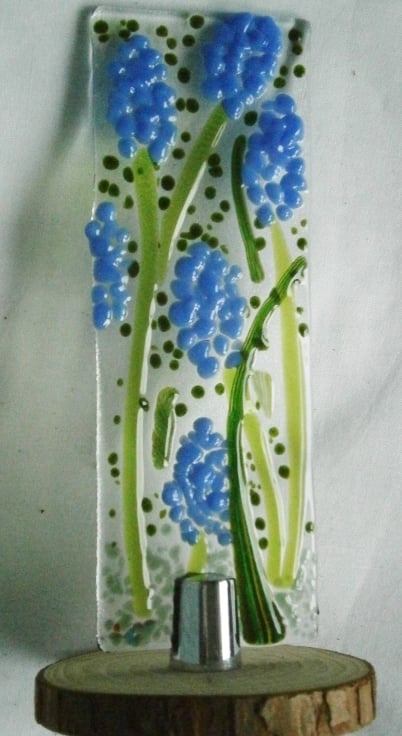Fused Glass Worry Poppet or Suncatcher with Glass Fused to Resemble Blue Muscari/Grape Hyacinths"Add a touch of calm to your day with this gorgeous fused glass worry poppet or suncatcher! Featuring beautiful blue muscari/grape hyacinths, this stunning piece is sure to lift your spirits.