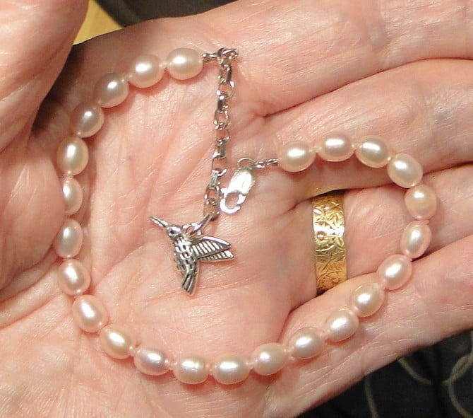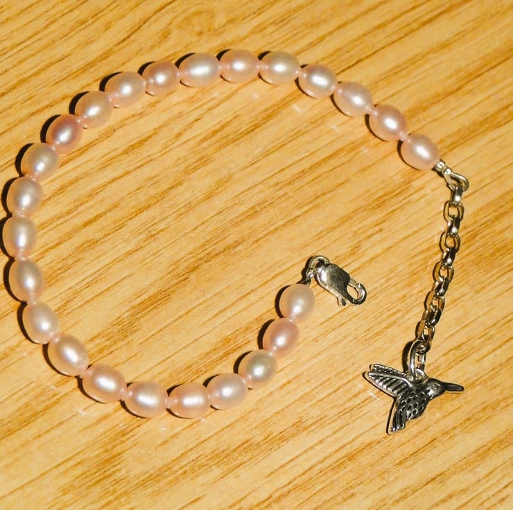 Pale pink bracelet with pearl beads (6mm x 4mm) and sterling silver chain and clasp. A pretty present for a young lady. Silver Bird charm.
