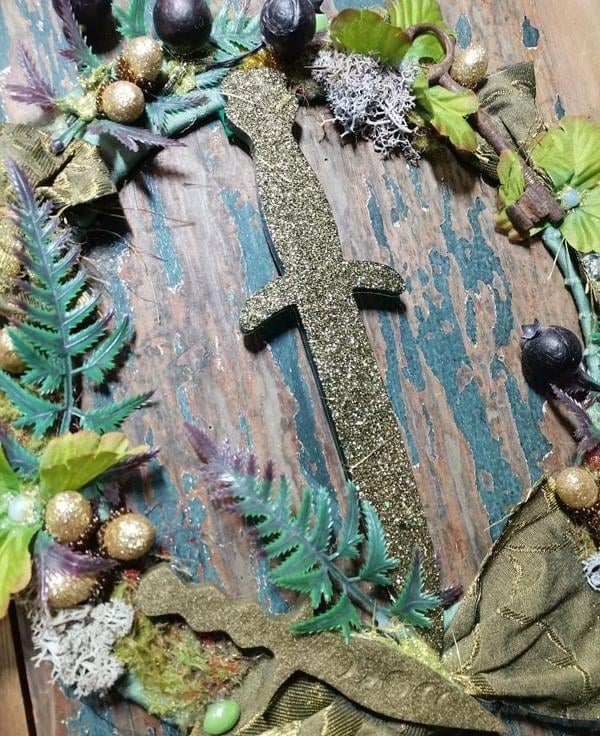 I created this piece using layers of vintage fabric, hand tied bows, glitter, moss, faux moss, faux foliage, tiny glitter beaded acorns and two hand made resin daggers....
