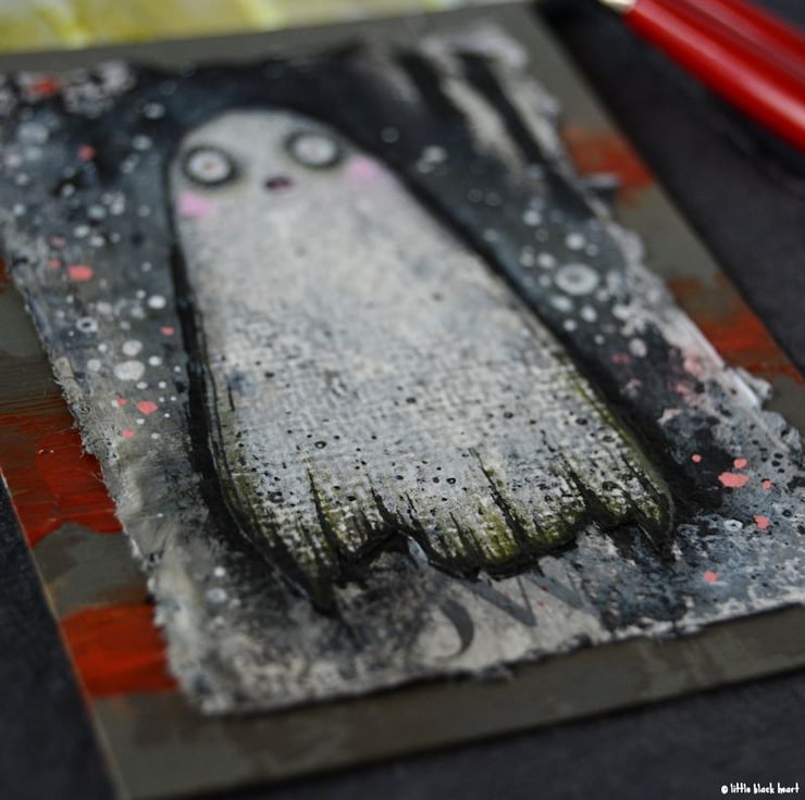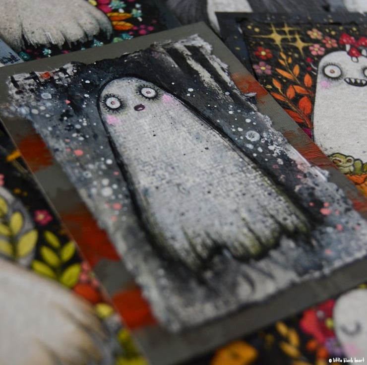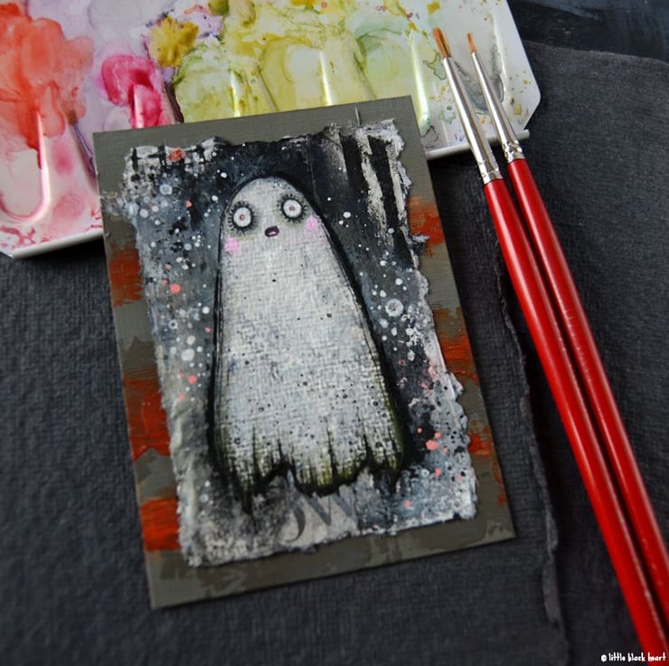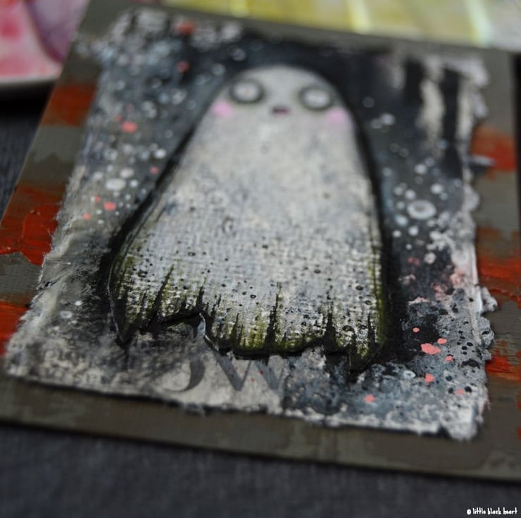 this mixed media aceo is an original collaged artwork, made with layers of tissue and khadi papers. hand drawn and then coloured with ink, artists pens and watercolour paints, on indian khadi paper. khadi paper is handmade from recycled cotton rag, it has a lovely textured surface and deckled edges. i have then mounted the illustration onto 300gsm cardstock, hand painted with acrylics to create a striped surrounding edge/background.