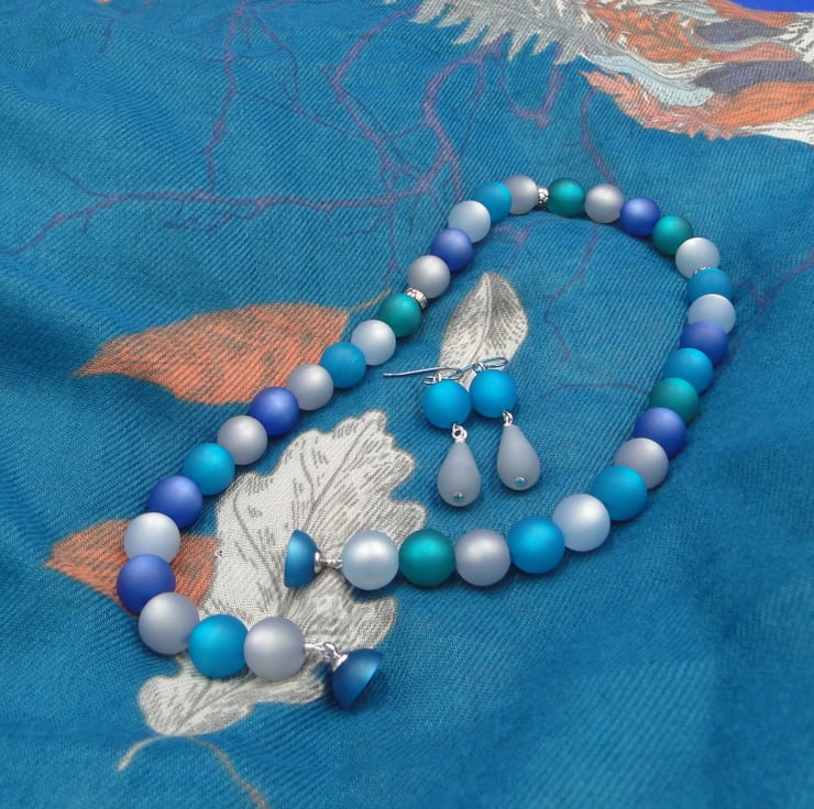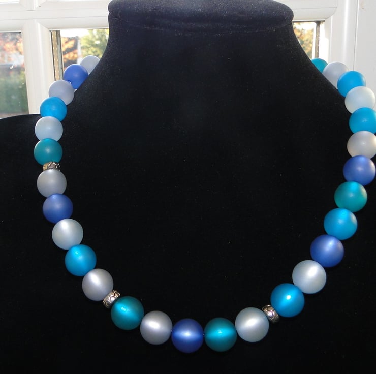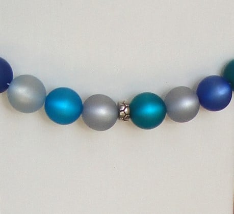 Necklace mad of Polaris beads in a range of colours from grey, blues, turquoise and green with sterling silver highlights and a matching magnetic clasp
