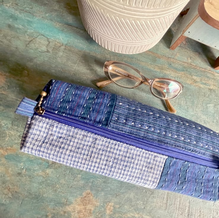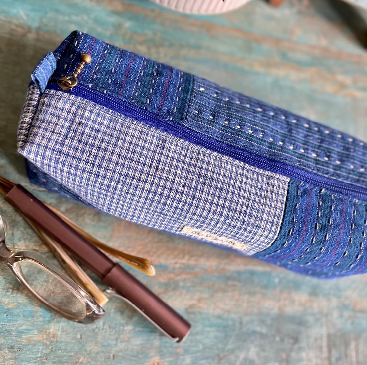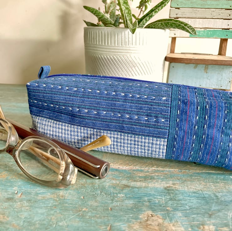 Keep your stationery or creative tools organized with this spacious pencil case, designed to hold a complete set of coloured pencils or markers. Made from durable vintage fabric, it's adorned with subtle handmade details that celebrate the beauty of imperfection. Measuring 18.5cmW x 6.5cmH x 7cmD, it is fully lined and has ample room for all your artistic essentials. It's the perfect companion for students, artists, or anyone who enjoys being prepared to create on the go. This case is more than just functional - it's a unique piece that reflects the history and charm of its handcrafted origins.