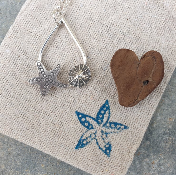The perfect pendant for a beach lover. This open teardrop shape measures approximately 36mm top to bottom by 24mm across. It is formed from 2mm round and features a starfish and a silver shell cast from a real limpet. It hangs from a sterling silver belcher chain which fastens with a bolt clasp.