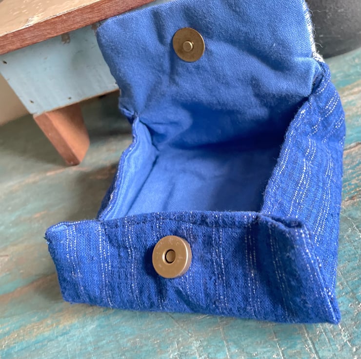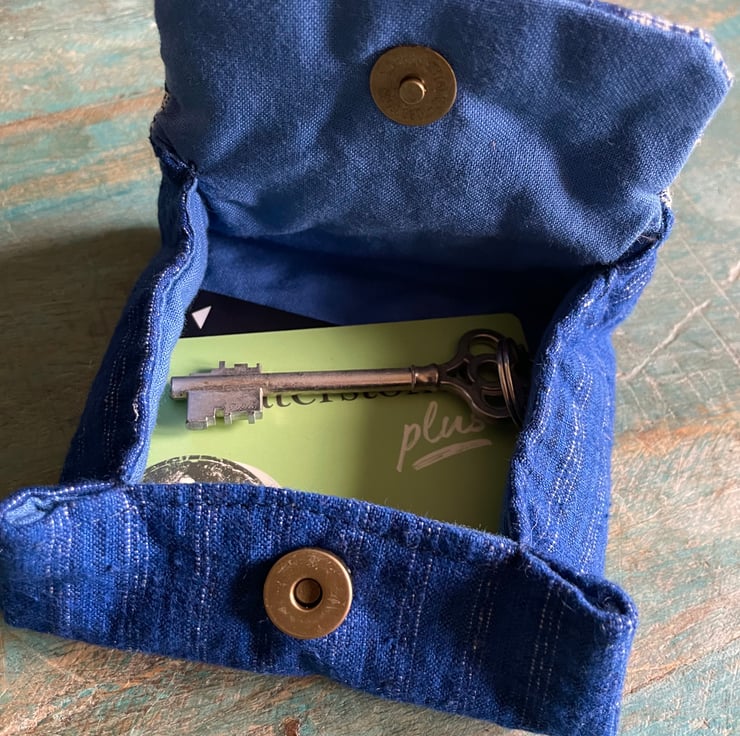 Made with vintage fabrics and closed with a magnetic button, this 10cmW x 9cmH x 3cmD, fully lined purse is an unique blend of practicality and style. It's handcrafted with love, embracing the beauty of imperfection in both form and function.