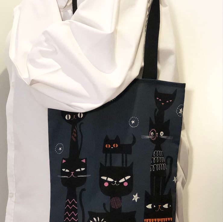 This tote bag featuring a clowder of felines measures 24cm x 32cm and has soft handles of 51cm long.