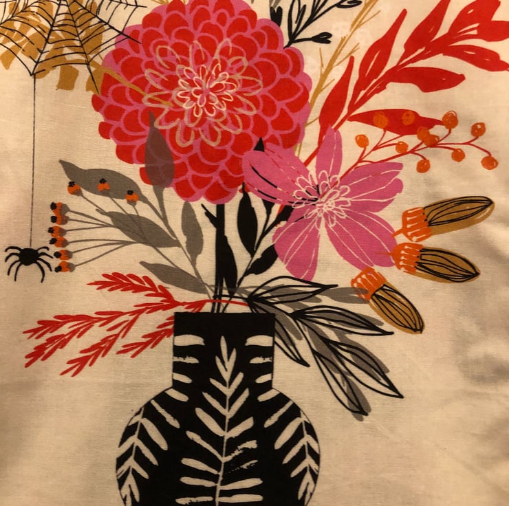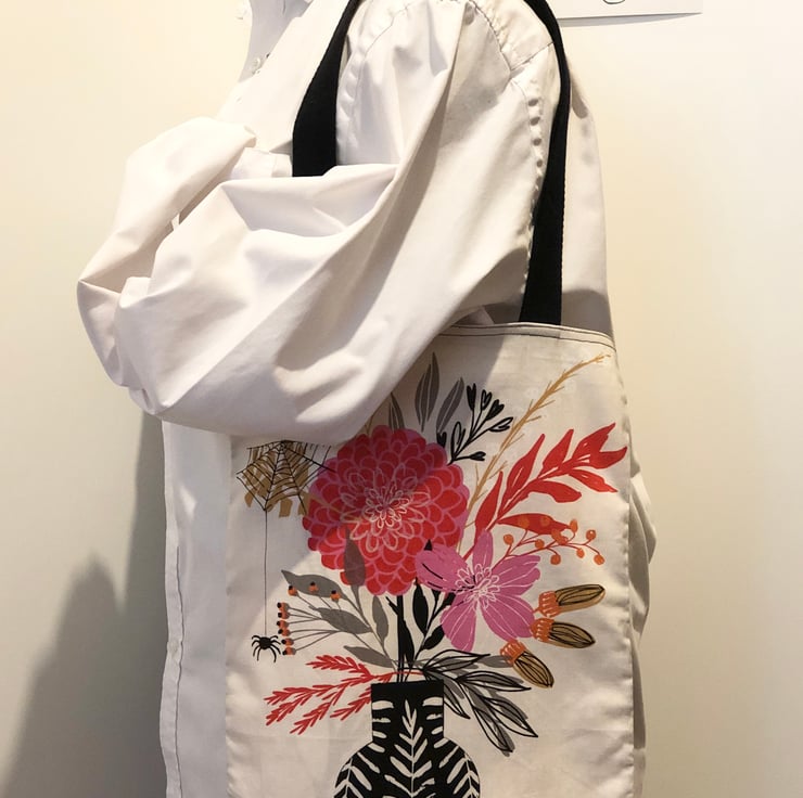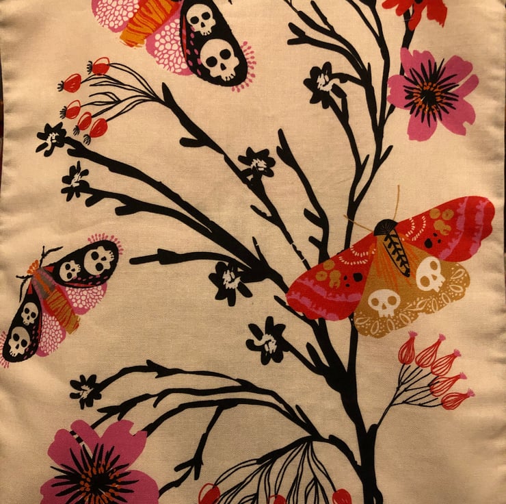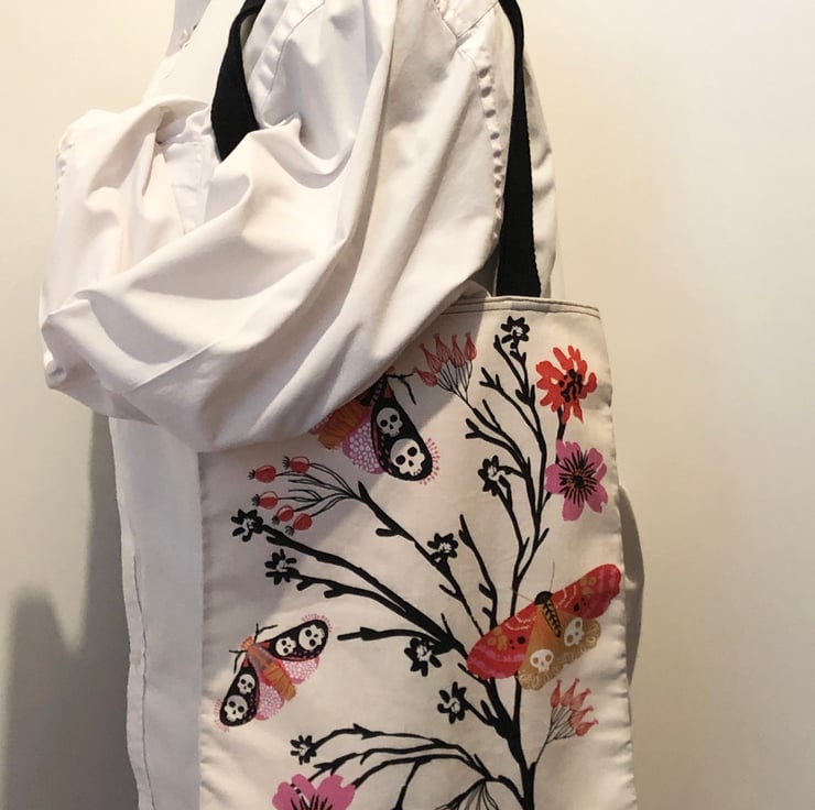 A branch bursting with berries and flowers is featured on this handy tote bag, and amongst them flit moths with skull-patterned wings. The reverse of the bag shows a vase of flowers in bright pink and orange which has been infiltrated by a lone spider who dangles, surveying its kingdom!