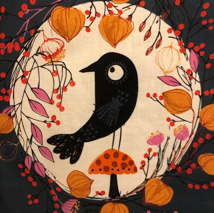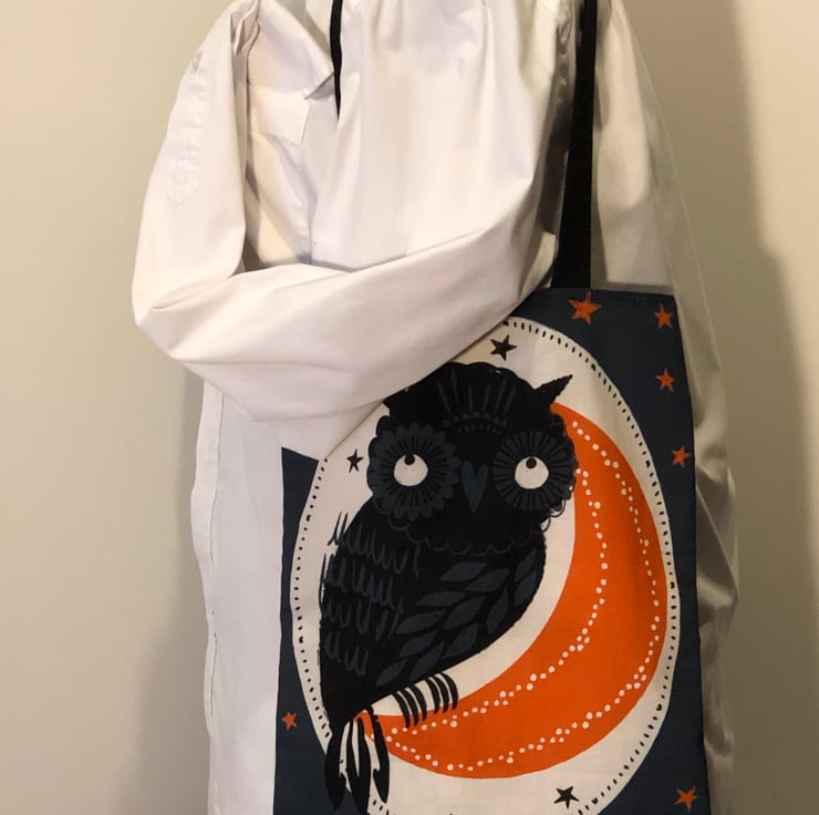 Add a splash of colour to your days with this tote. An owl on the hunt is featured on one side, his eyes large, under orange stars whilst sitting on an orange crescent moon. A black crow is on the other, he stands on a toad-stool surveying the full moon with a watchful eye, surrounded by seeds, berries and flowers.