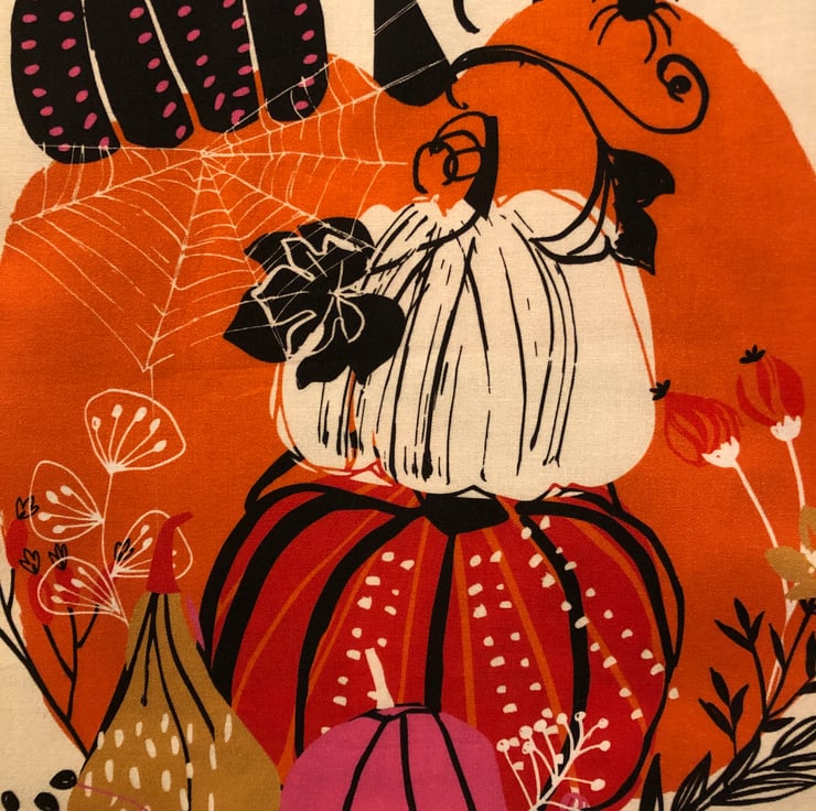 Featuring pumpkins, displayed at their best and watched over by a spider who has created his web over them, the reverse shows a cloud of bats, flitting across the face of a full moon, under which grows a deadly toadstool – known by the skulls marking its red cap. Bright foliage surrounds the scene in orange and black adding a splash of colour.