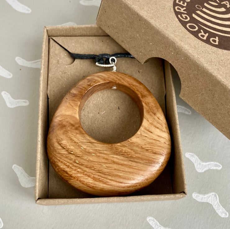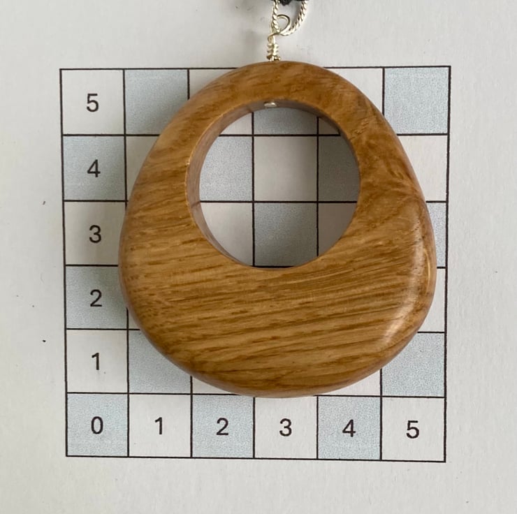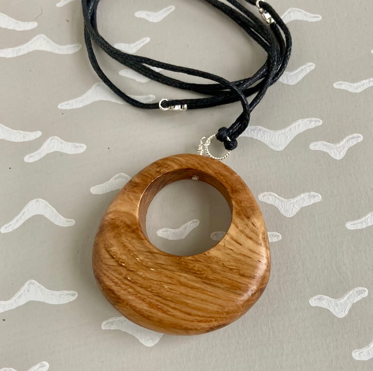 A handmade wooden pendant necklace using a beautifully grained oak and finished with a hard wax satin polish. The pendant is egg shaped, gently tapering in thickness towards the top. The outer edges are rounded giving it a smooth feel especially with the hard wax finish.