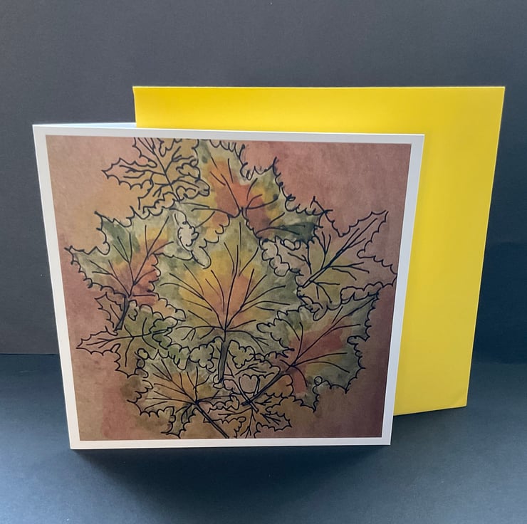This card is an original watercolour and painting in autumnal colours, and with a modern twist ,The card measures 142x142mm and is printed on 300gms matte card with a silk finish .The card is blank inside for your own message ,and is presented with a complimenting coloured envelope and protected with a removable cellophane sleeve
