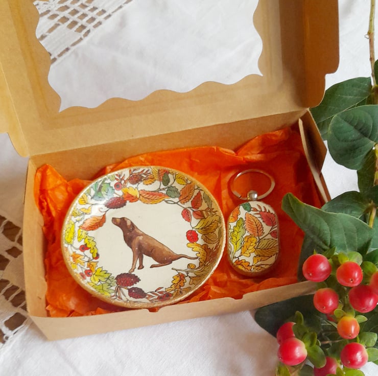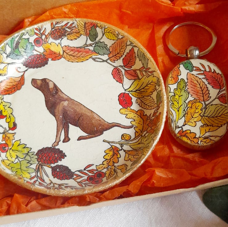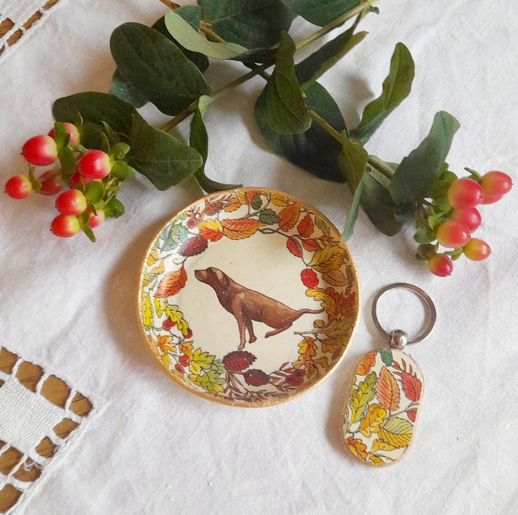 Decorated using Decoupage technique it features a Labrador amongst Autumn leaves upon the dish.