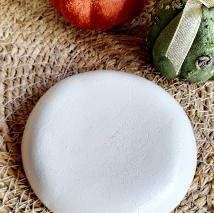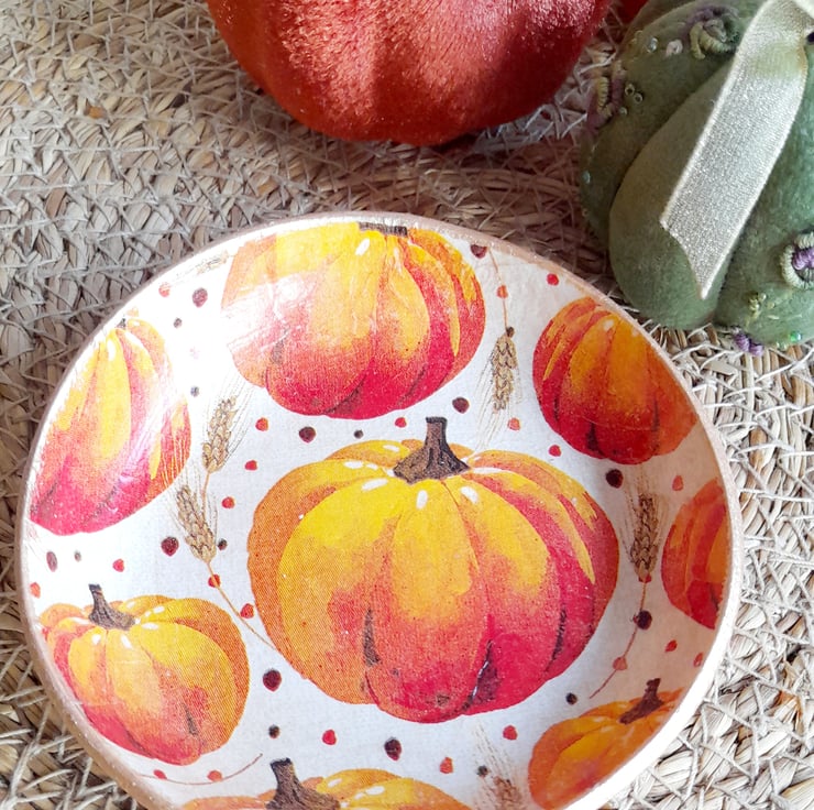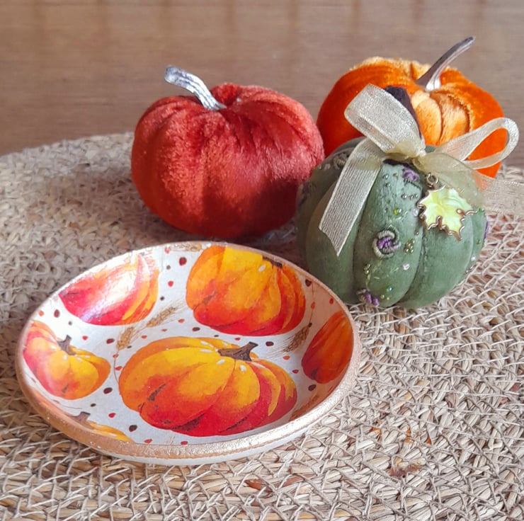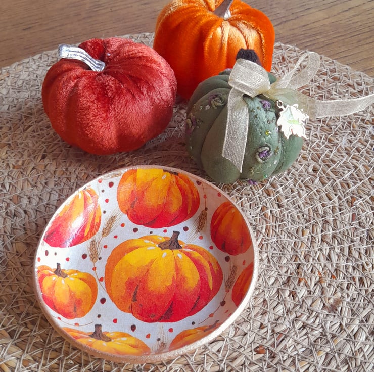 Handmade Clay Trinket Dish has been decorated using a decoupage of lovely vibrant pumpkins.