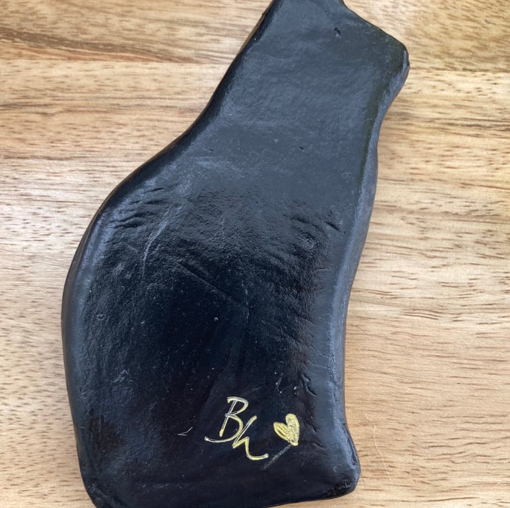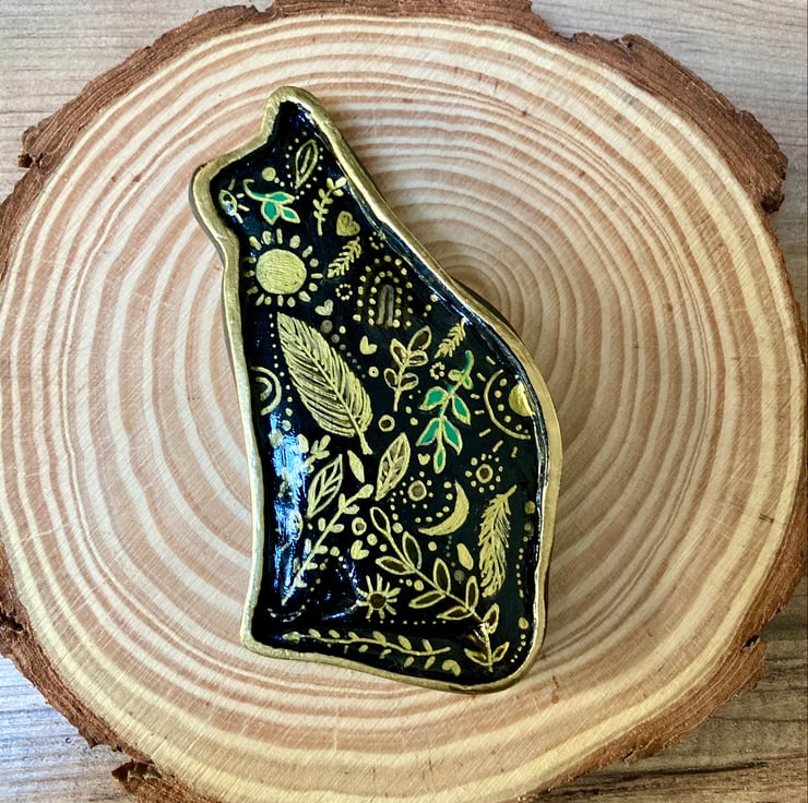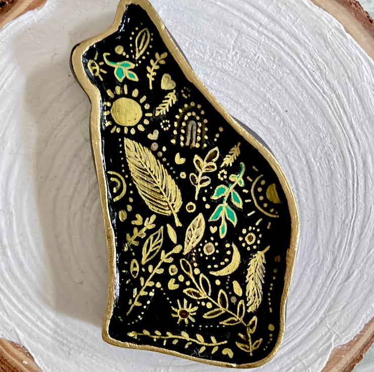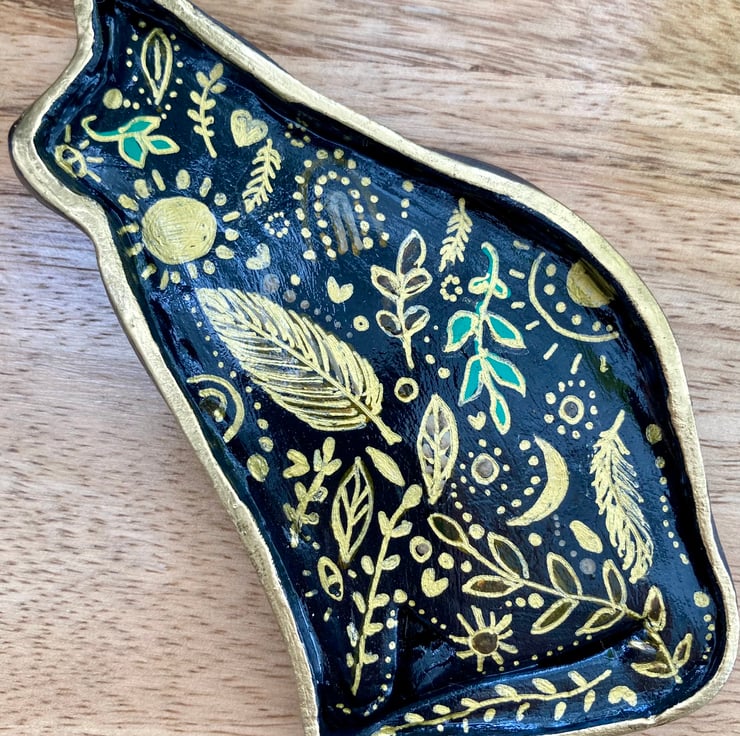 I made this small black cat bohemian patterned trinket dish from clay, an unfired clay known as air dry clay which,when dried, resembles ceramic once it's sanded, smoothed and painted.