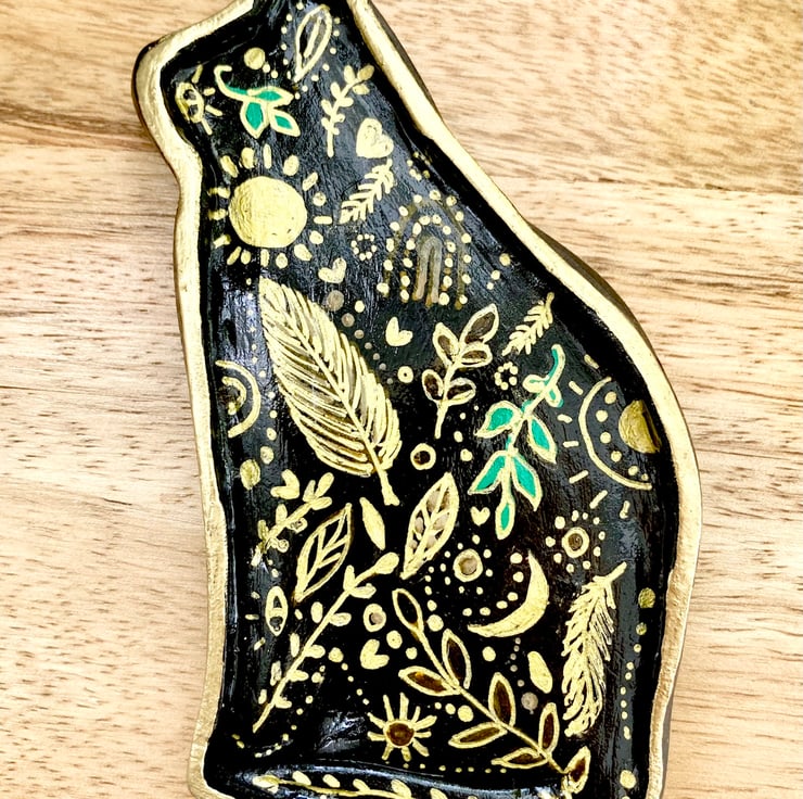 Beautiful Boho Black Cat Trinket Dish, Jewellery Tray, Hand Crafted & Painted