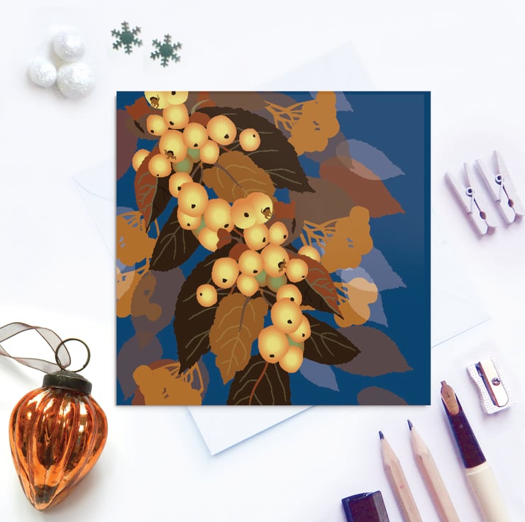 I have always admired these trees in Autumn - dripping with brightly coloured fruits and leaves about to fall. it makes a stunning pattern on this Royal Blue background.