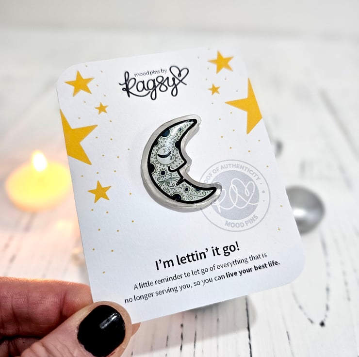This crescent moon acrylic pin is a vessel used to hold a gentle,yet powerful spell that draws on the natural energy of the full moon with the intention to aid the wearer in releasing any energies that no longer serve.
