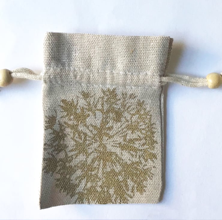 Gold Allium flower handprinted drawstring natural cotton small gift bag