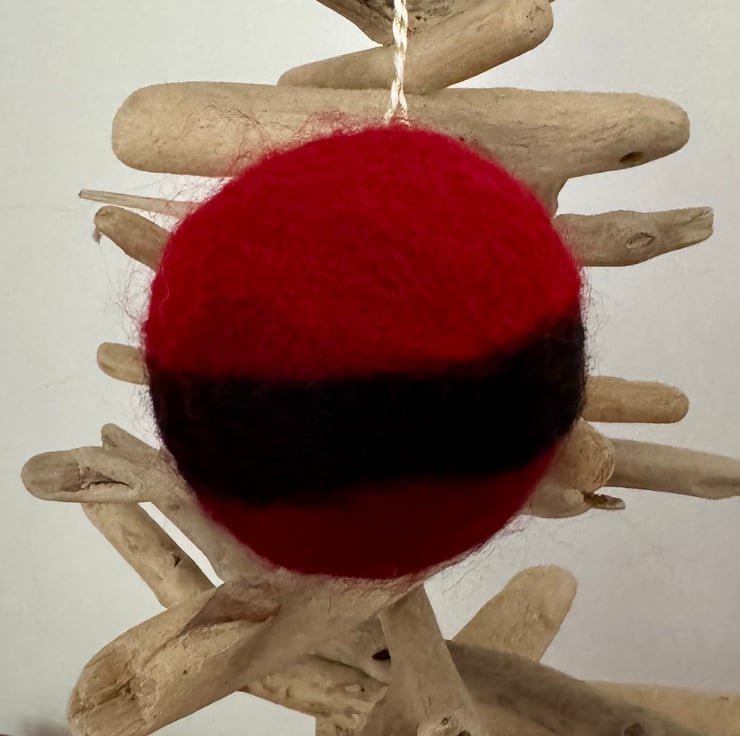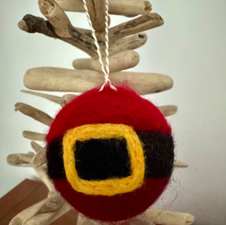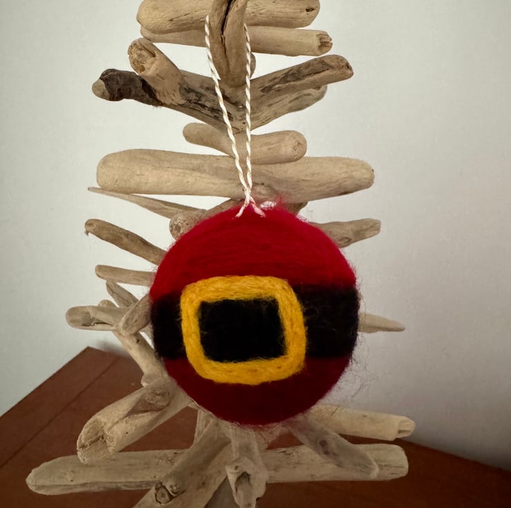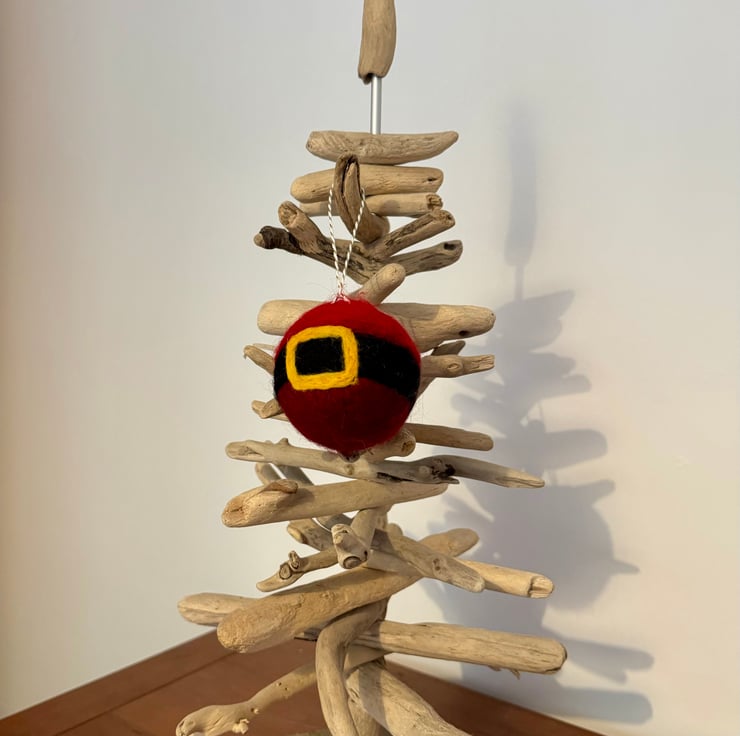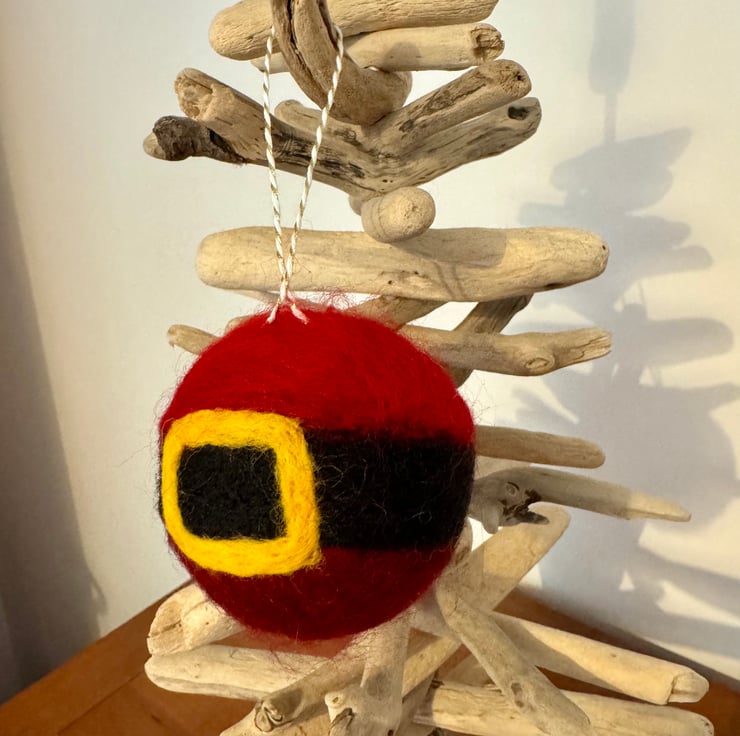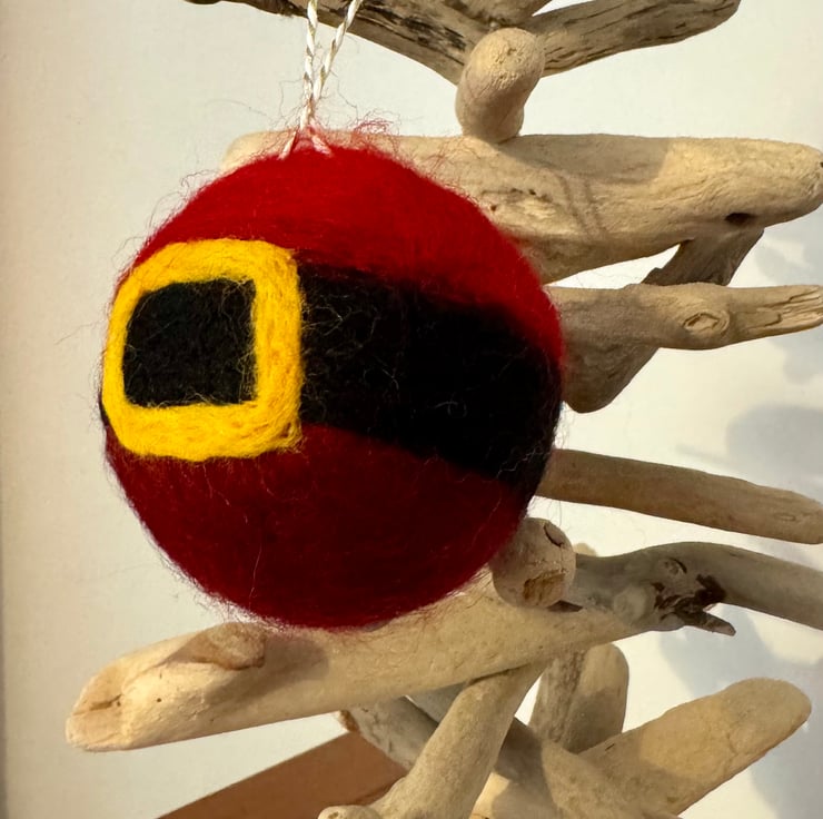A large, hand felted Santa’s Tummy Christmas bauble which has been handmade by me and is a one-off piece. The bauble measures 5.5cm with a hanging loop of 8cm.