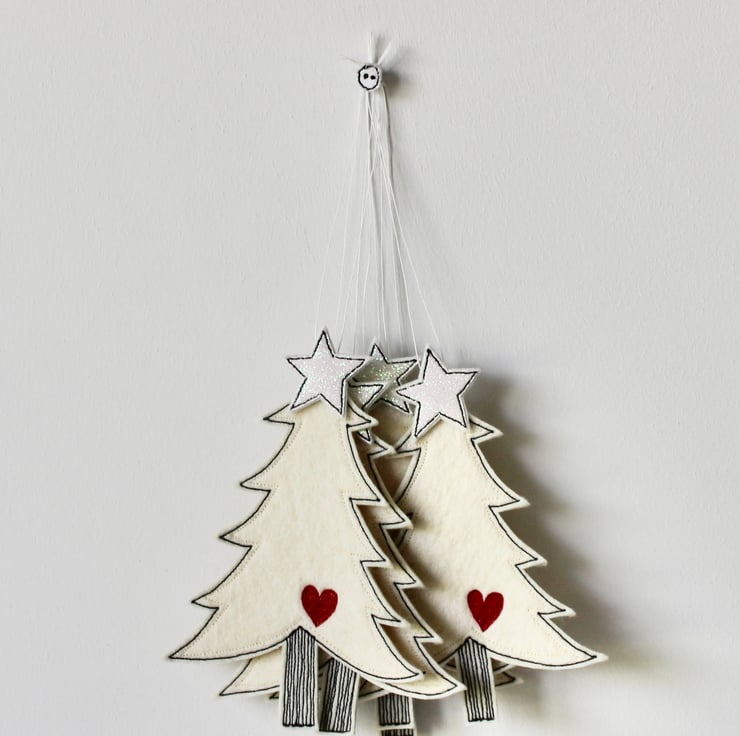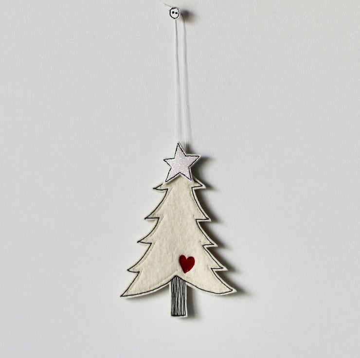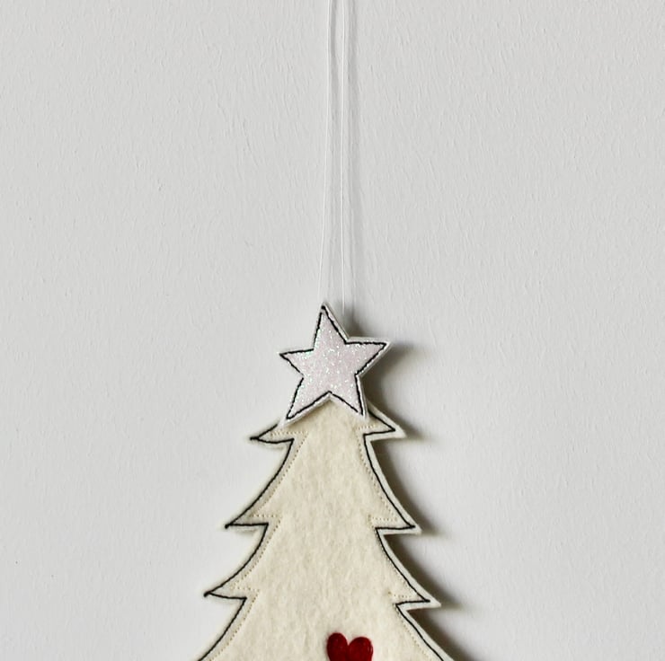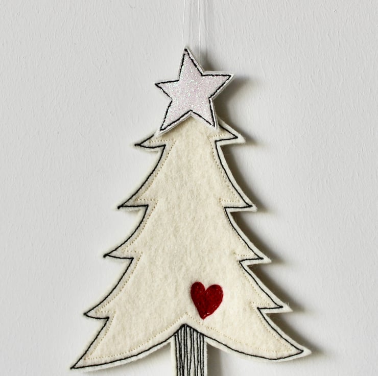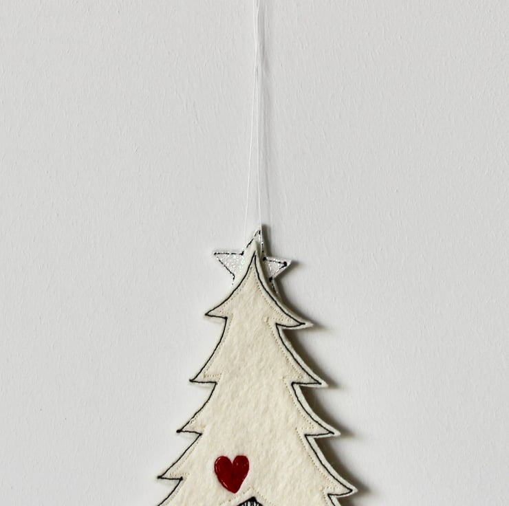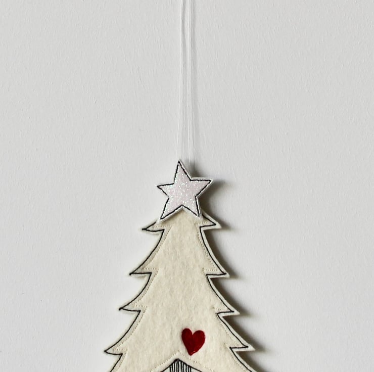 A delightful hanging decoration which is created using 100% wool felt, glitter cloth, cotton cloth, free hand machine embroidery and is cut out by hand, using a very sharp pair of scissors.