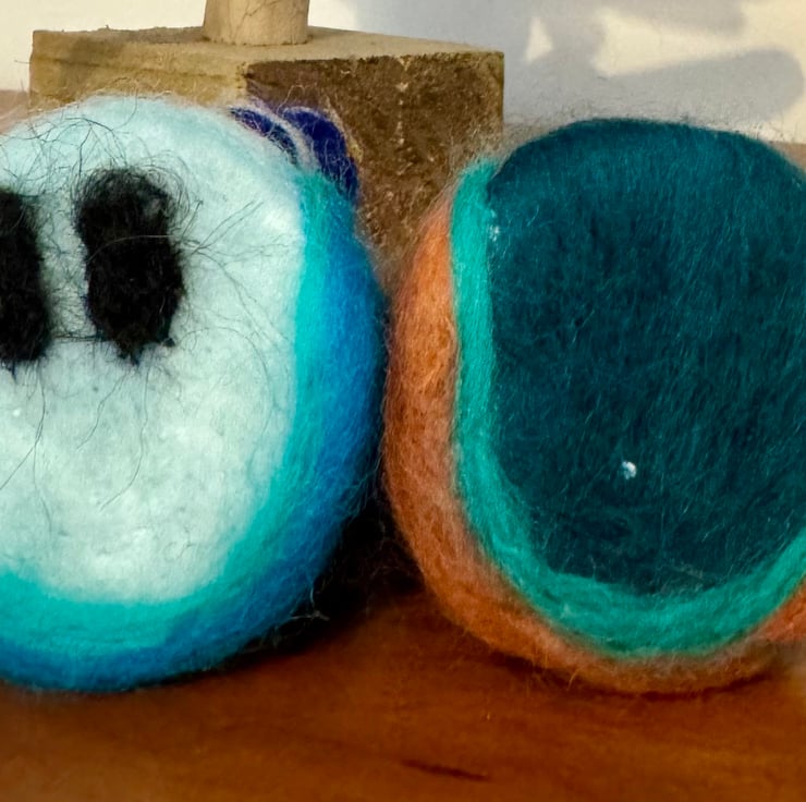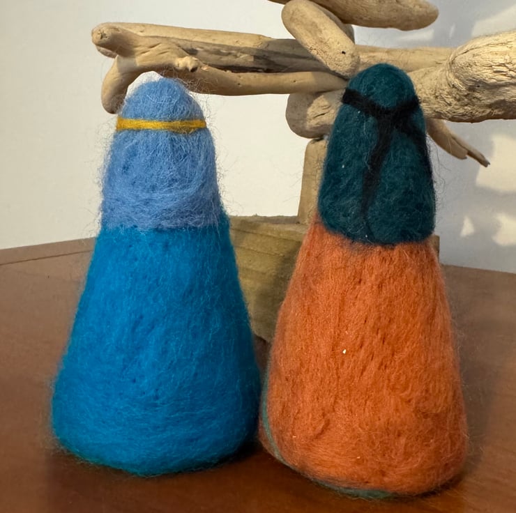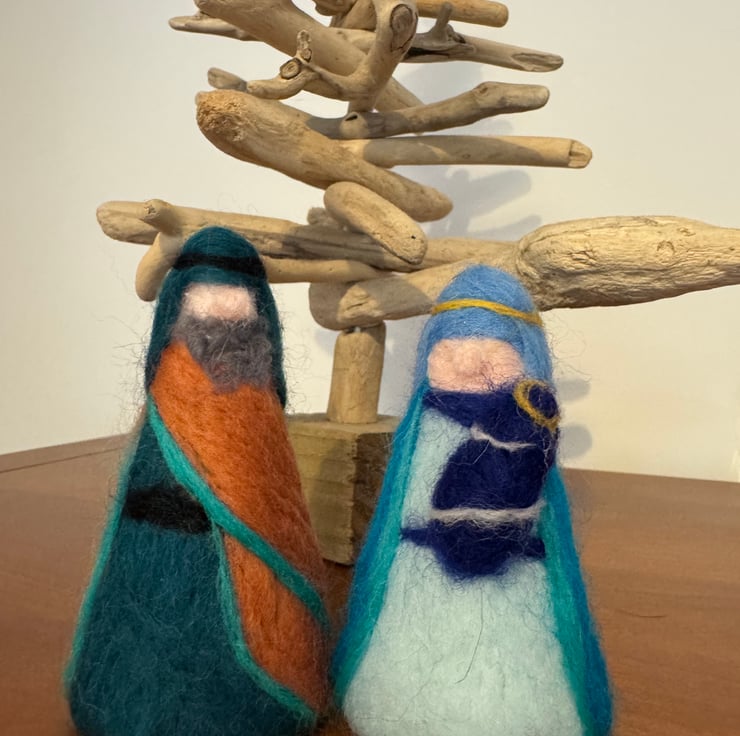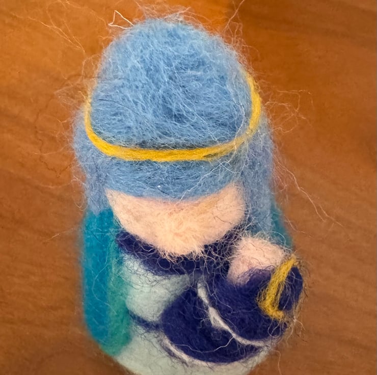 A sweet little nativity which has been felted by me featuring Mary, Joseph and a well swaddled Baby Jesus.