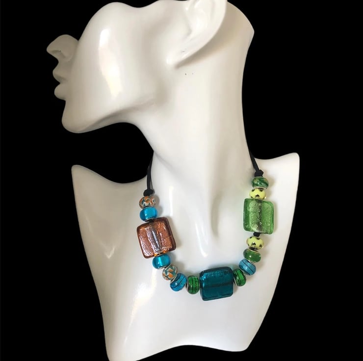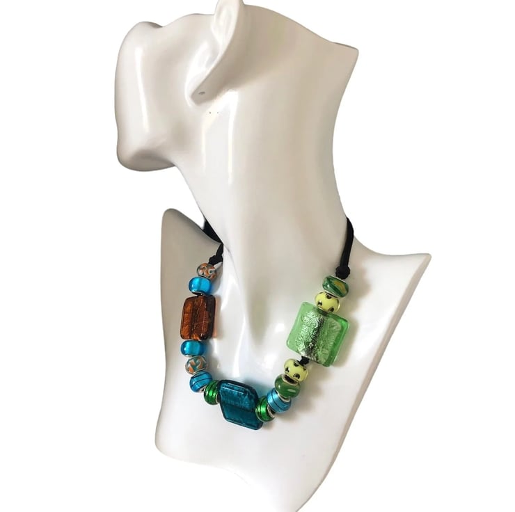 Statement necklace made of vibrant rectangular glass beads, glass & sterling silver Pandora style charms, aluminium and silver plated findings plus a black suede strap.