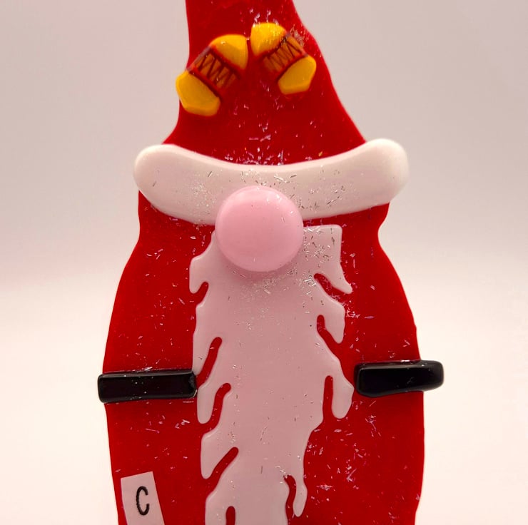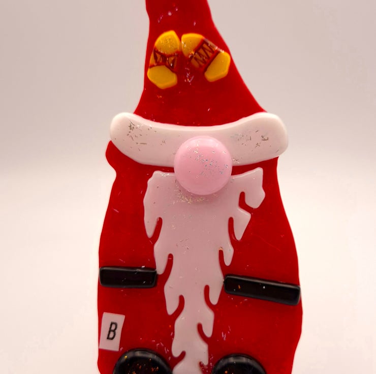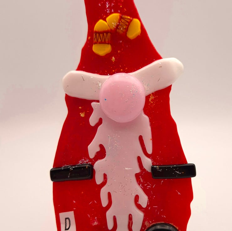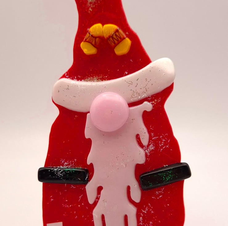 A Fused Glass Santa Gnome with Yellow bells detail on its hat. Hand-cut glass shapes were fused, and dichroic essence was added to the final firing to give the piece a bit of Christmas Sparkle. The Gnome has a red glass hat and body. White glass is used for the beard, bobble, and trim on the hat. Black glass for its belt and shoes. Also, pink glass for the nose. It is approximately 17cm in height and 7cm wide. I enclose a stand for this piece, but it also has a hanger on the rear, so hanging it on a wall is an option. Please let me know which one you would like.