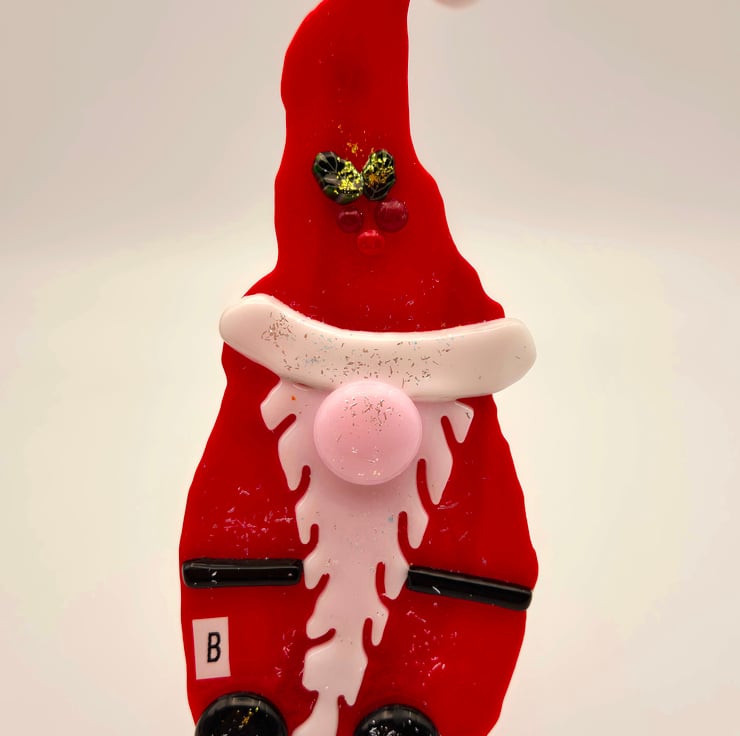 A Fused Glass Santa Gnome with Holly leaves and Berries detail on its hat. Hand-cut glass shapes were fused, and dichroic essence was added to the final firing to give the piece a bit of Christmas Sparkle. The Gnome has a red glass hat and body. White glass is used for the beard, bobble, and trim on the hat. Black glass for its belt and shoes. Also, pink glass for the nose. It is approximately 17cm in height and 7cm wide. I enclose a stand for this piece, but it also has a hanger on the rear, so hanging it on a wall is an option.. Please lat me know which one you would like.