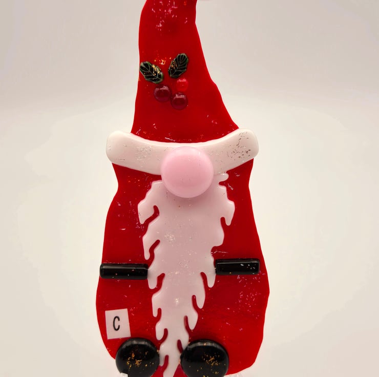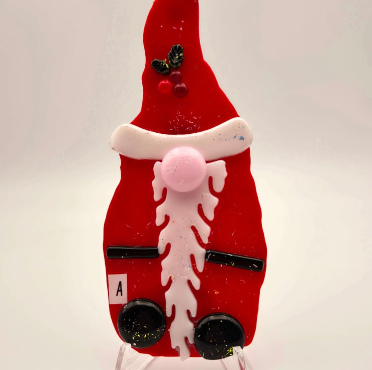 Fused Glass Santa Gnome Christmas Decoration with Holly detail with Stand