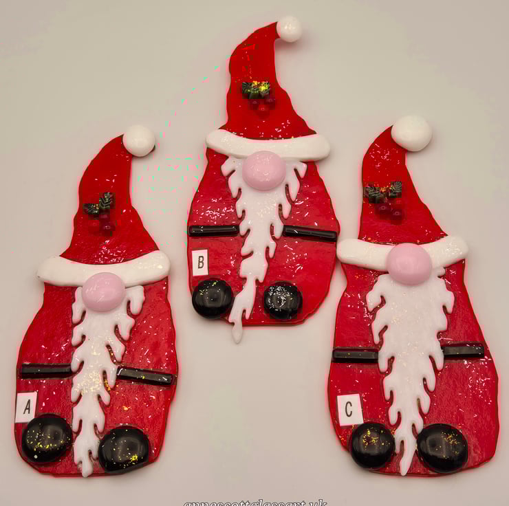 A Fused Glass Santa Gnome with Holly leaves and Berries detail on its hat. Hand-cut glass shapes were fused, and dichroic essence was added to the final firing to give the piece a bit of Christmas Sparkle. The Gnome has a red glass hat and body. White glass is used for the beard, bobble, and trim on the hat. Black glass for its belt and shoes. Also, pink glass for the nose. It is approximately 17cm in height and 7cm wide. I enclose a stand for this piece, but it also has a hanger on the rear, so hanging it on a wall is an option.. Please lat me know which one you would like.