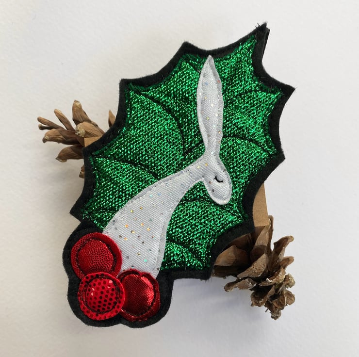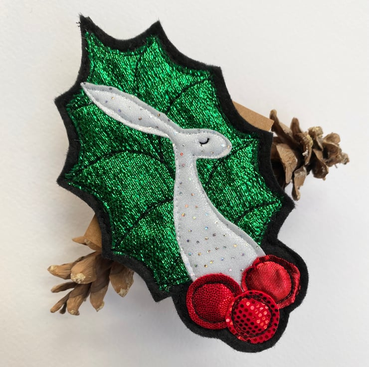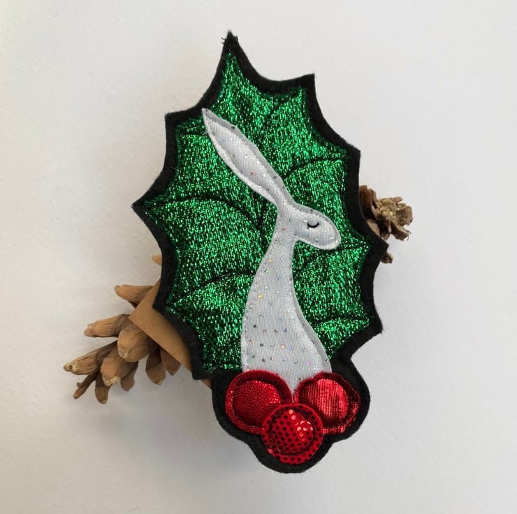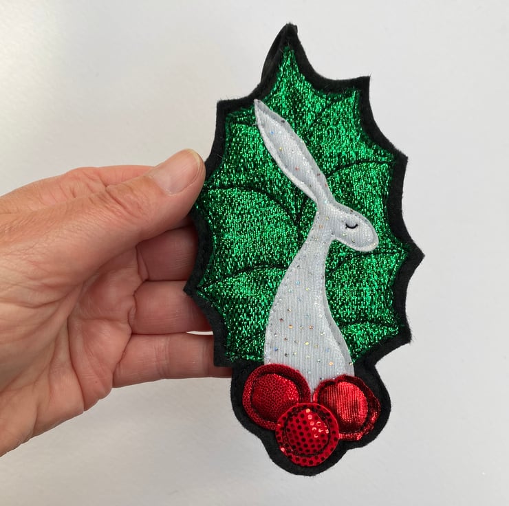 This seasonal embroidered hare home decorations shows a hare framed by a holly leaf with berries. It has been made from up-cycled fabrics and stitched down with free motion embroidery. It comes felt backed and measure approx 8 x 13.5cm, with the ribbon the length is 21cm.