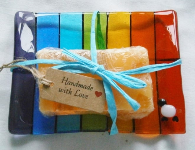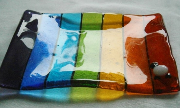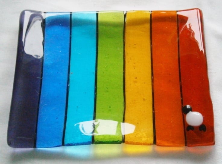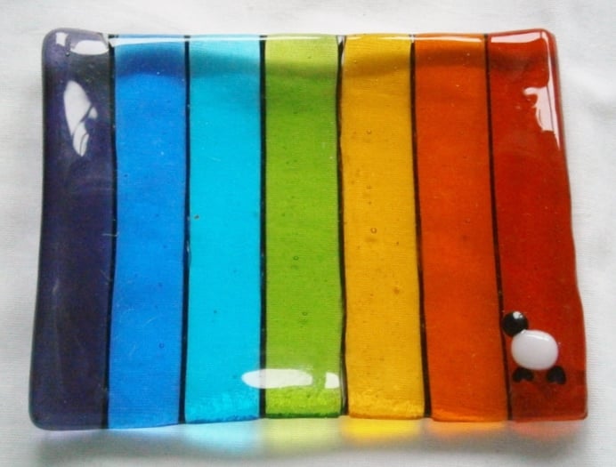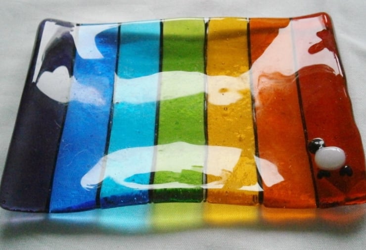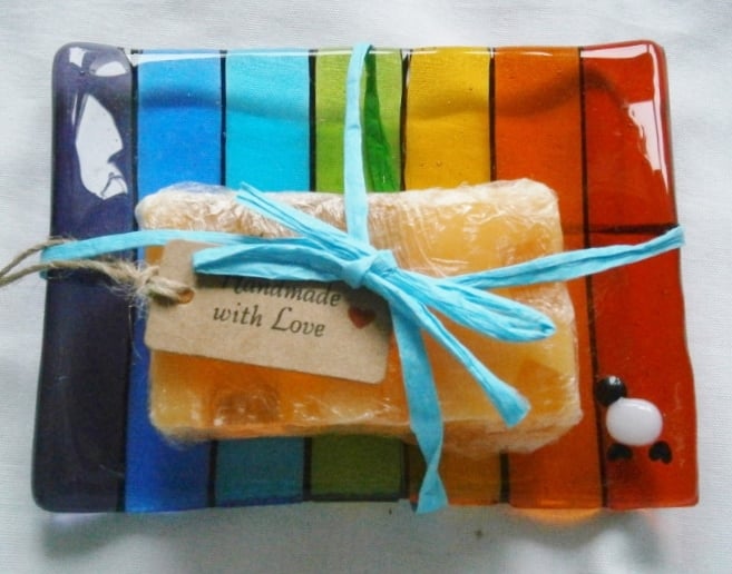 Rainbow charm in your bathroom! Our fused glass soap dish features strips of glass in a vibrant rainbow hue, a cute sheep in the corner, and sleek black pin stripes separating the colours. Comes with a small piece of handmade soap (may vary from photo). Measures approx 9cm x 12cm.
