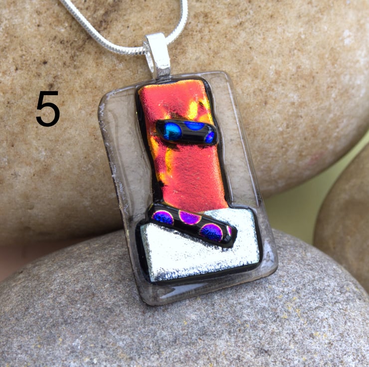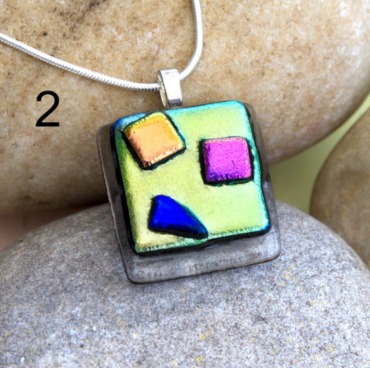 Five stunning and unique fused glass pendants. Each one has been cut and assembled by hand and then fired in a kiln to a tack fused temperature. This means that each piece of glass is melted together, but they still retain their individual shapes creating great texture and dimension. All the pendants have a clear glass base that the dichroic pieces are melted onto.