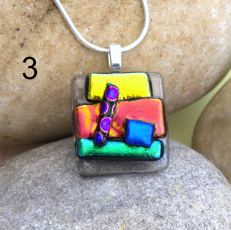 Five stunning and unique fused glass pendants. Each one has been cut and assembled by hand and then fired in a kiln to a tack fused temperature. This means that each piece of glass is melted together, but they still retain their individual shapes creating great texture and dimension. All the pendants have a clear glass base that the dichroic pieces are melted onto.