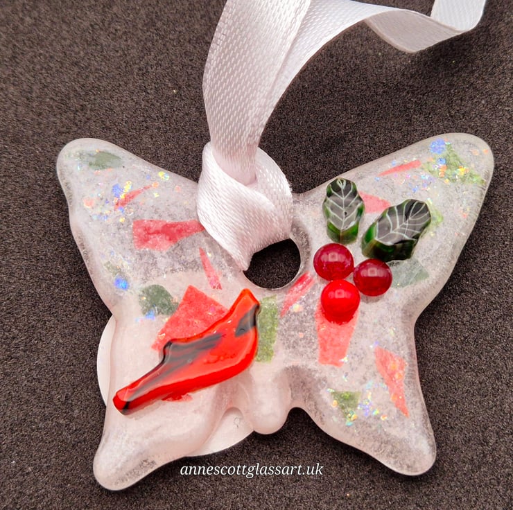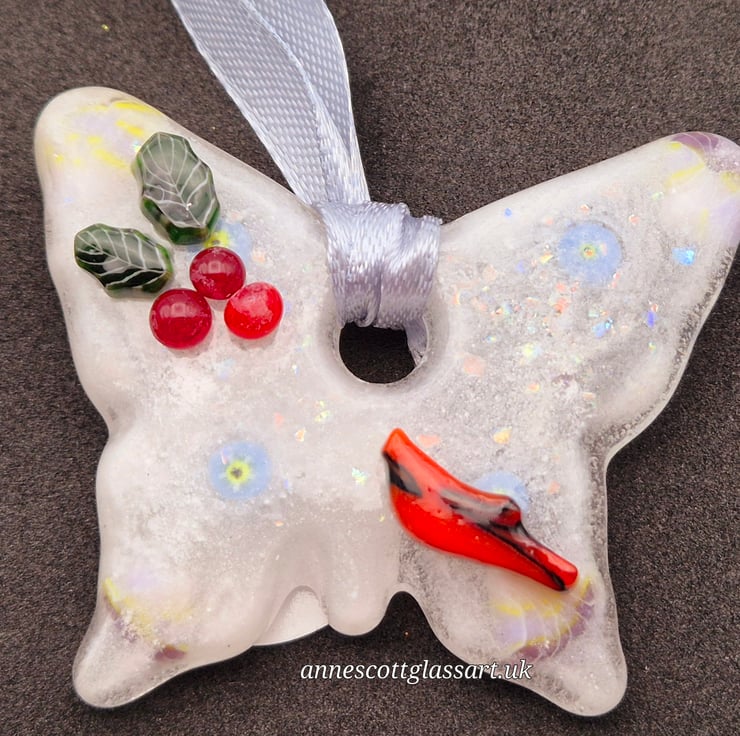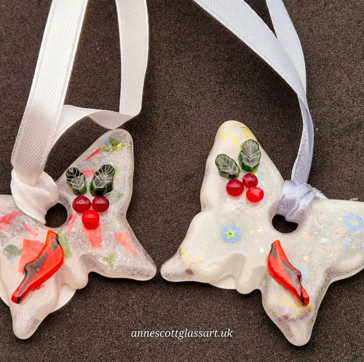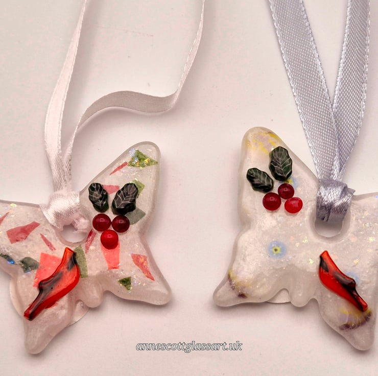 Two handmade fused glass butterflies. Each has a small sprig of holly and a red bird as decoration. One has multi-coloured glass wafers embedded in the clear fused glass. The second is opaline glass fused with clear with embedded murrine. Both are finished with dichroic essence to give them a bit of Christmas sparkle. They are approximately 6cm x 5cm and hang from a white or silver ribbon.