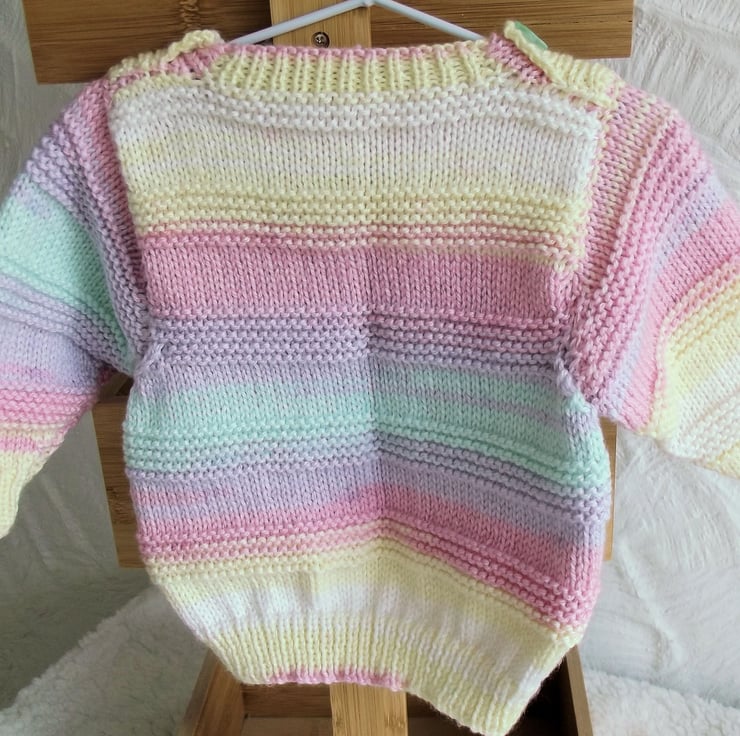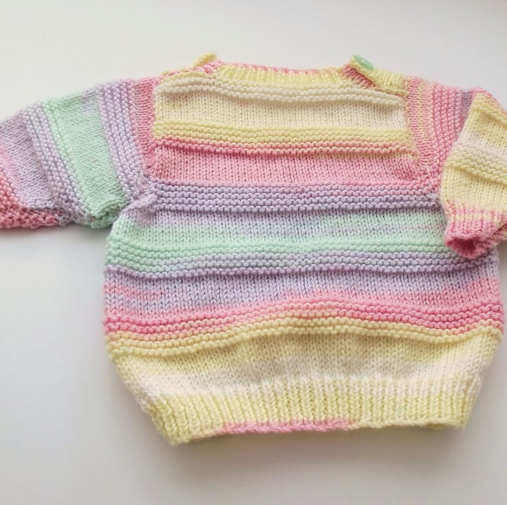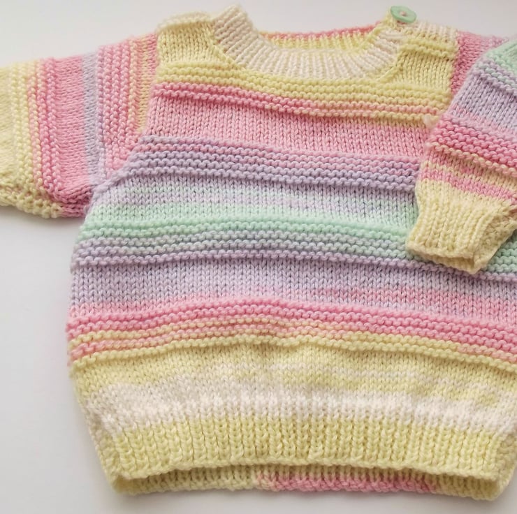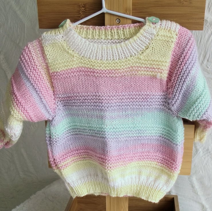 Hand knitted by me. Pastel Shades Jumper. Round neck with 2 button closure. Knitted in medium weight acrylic blend yarn. hm6