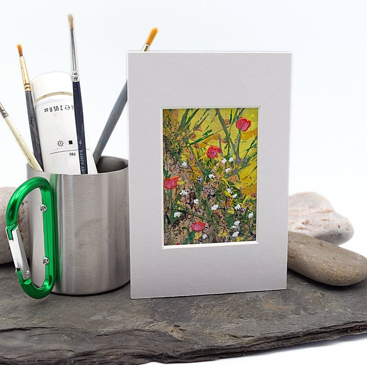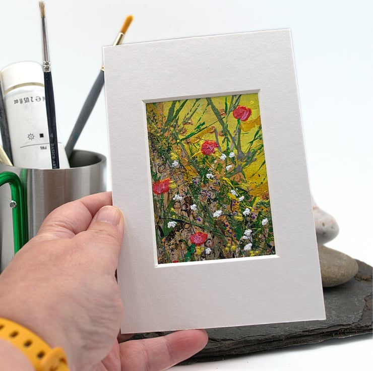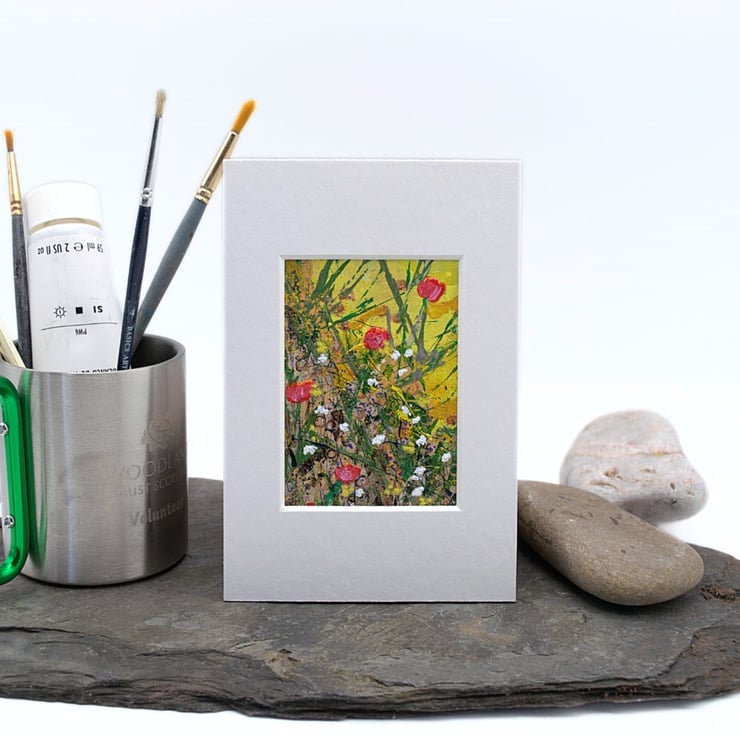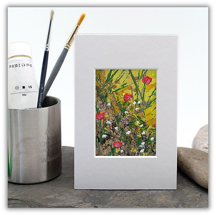 This is a small mounted painting. This colourful collectible depicts a mass of red and white wildflowers and thick tall grasses. I have used a combination of brushes and old pins to apply thick layers of acrylic paint on to the paper.