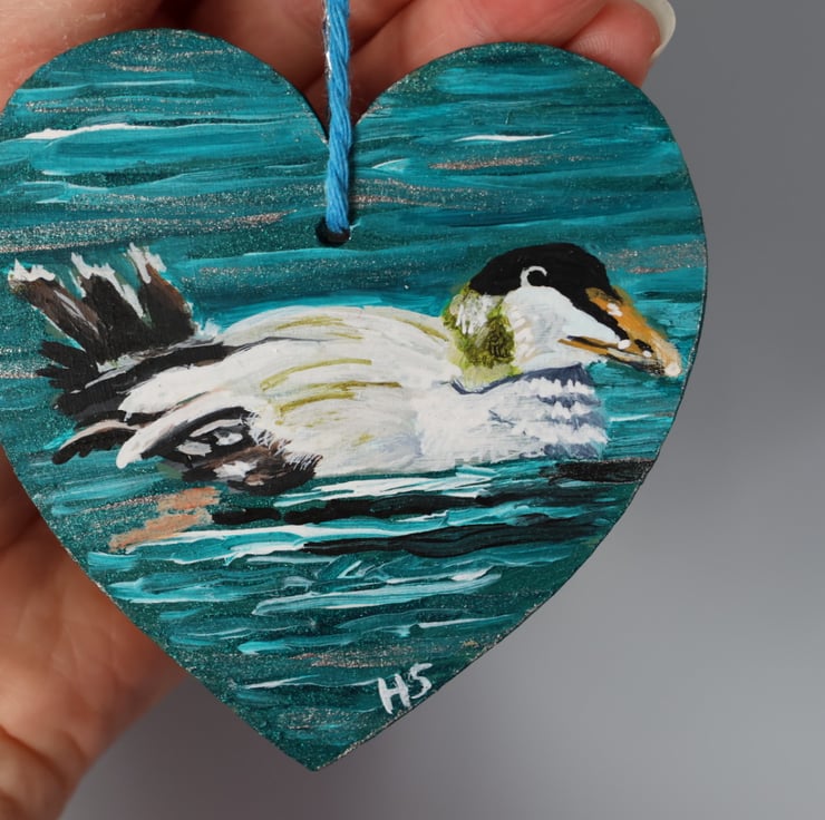 This majestic Eider Duck has been painted in acrylics on a 8cm by 8cm wooden heart.