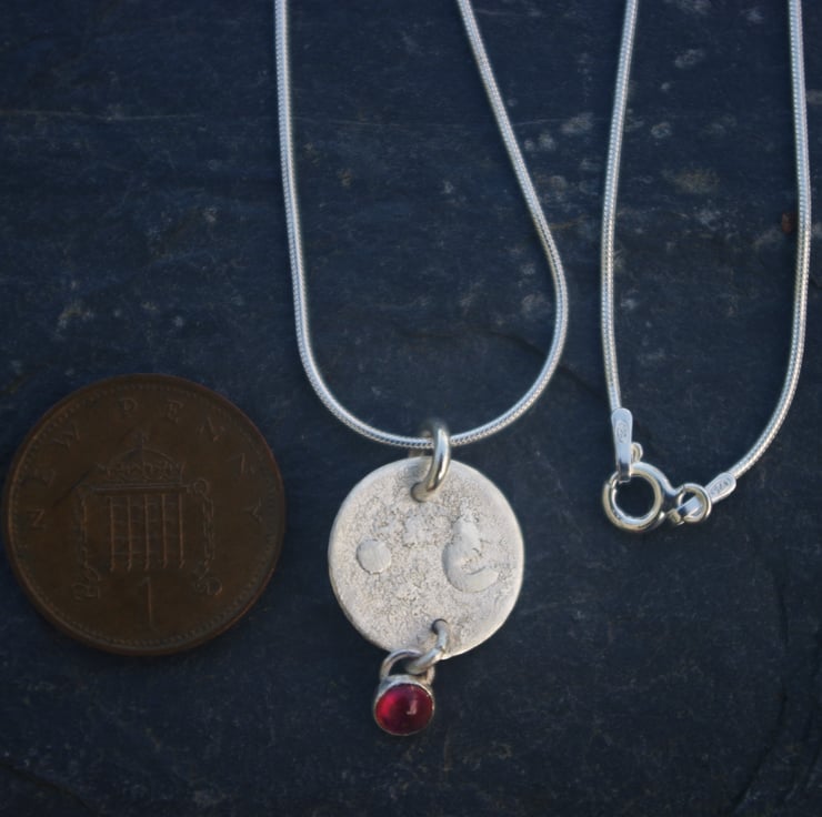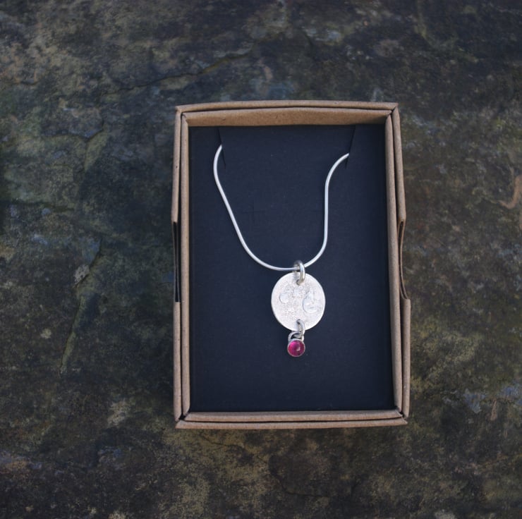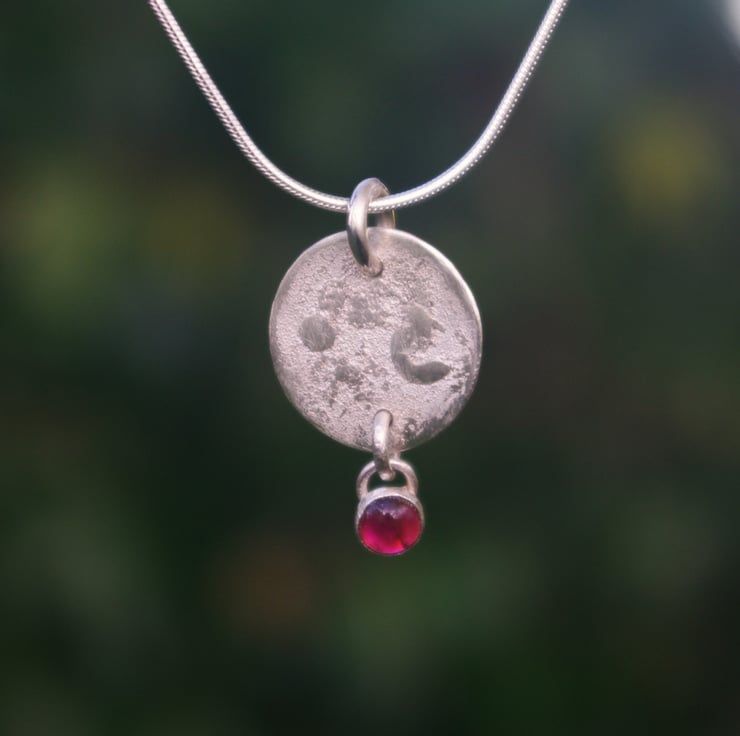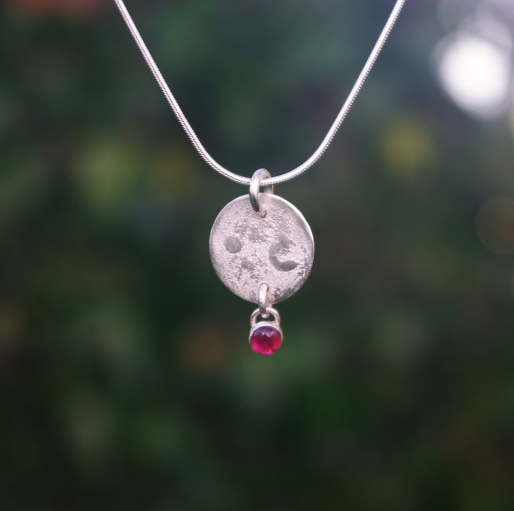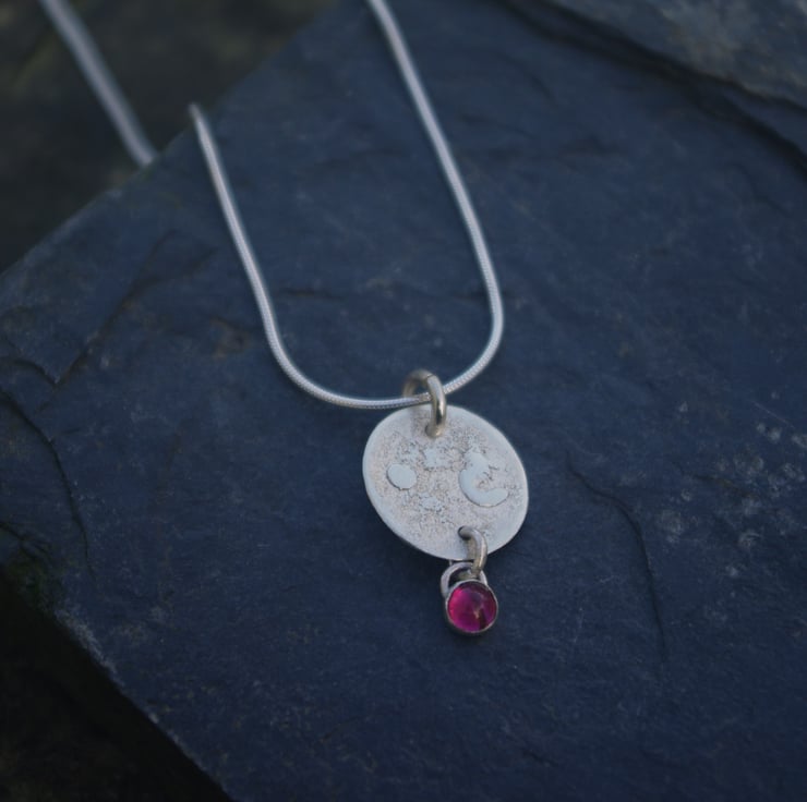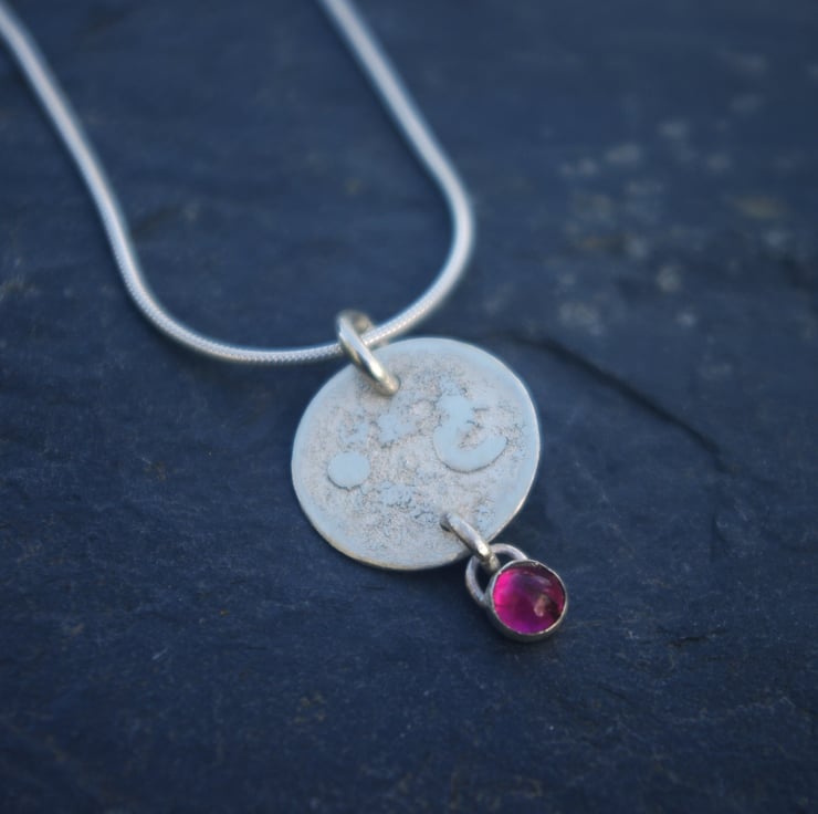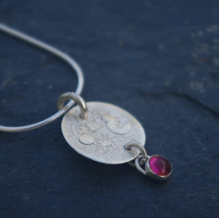 A textured, sterling silver pendant with a beautiful deep pink Tourmaline gemstone. This dangles from the bottom edge and has a diameter of 4mm. The texture has been fused onto the circular pendant using my left over bits of silver All silver is from an eco source.