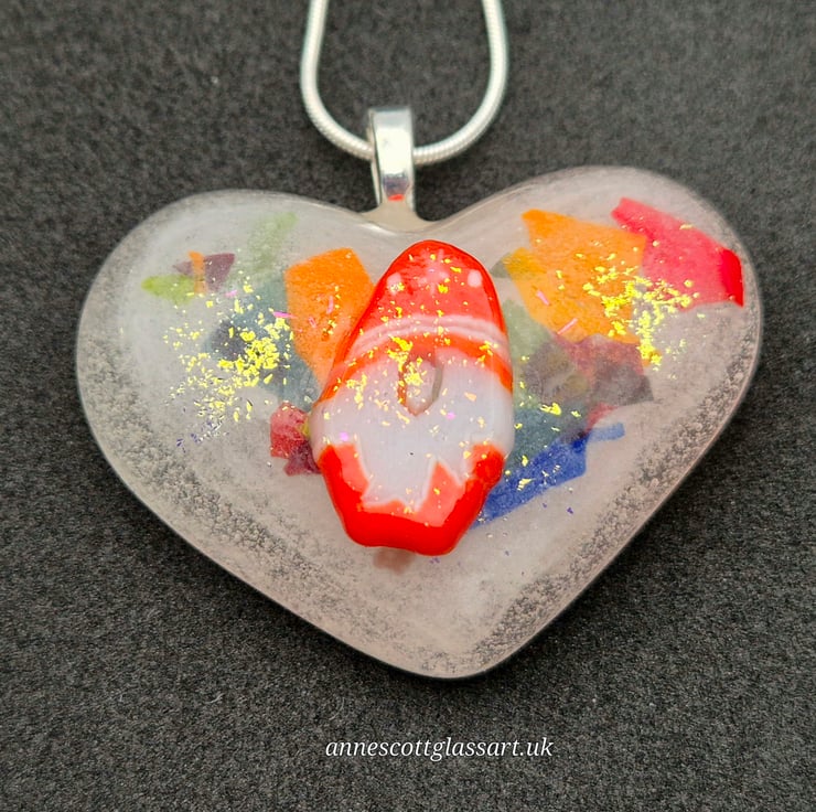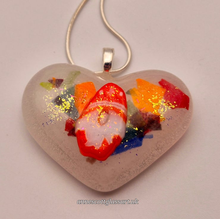 Handmade fused glass pendant. Clear glass and multi-coloured wafers embedded in the shape of a heart. This has a 3D Santa and a brushing of dichroic essence to give it a bit of Christmas sparkle. it is 5cm x 5cm appox. It has a silver-plated bail and an 18-inch snake chain.