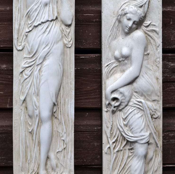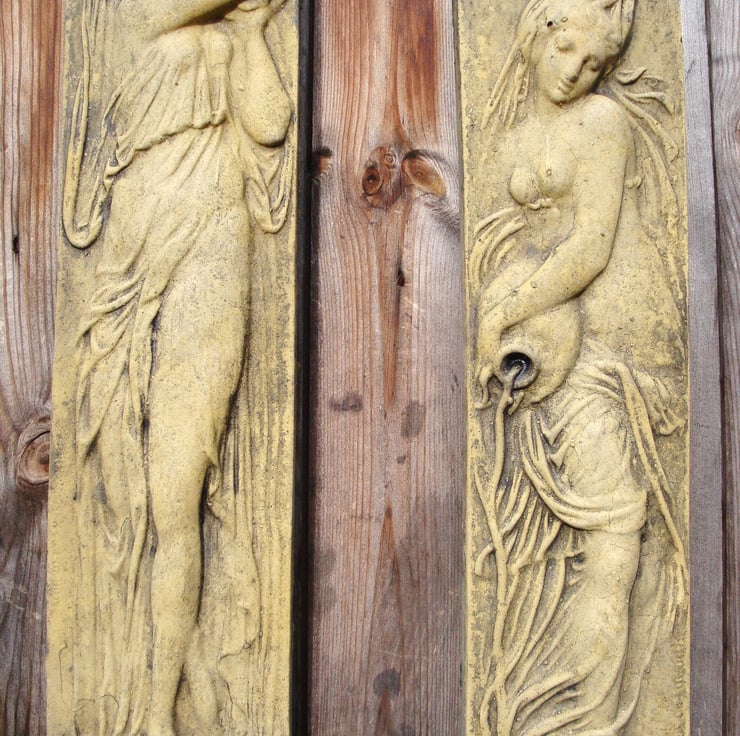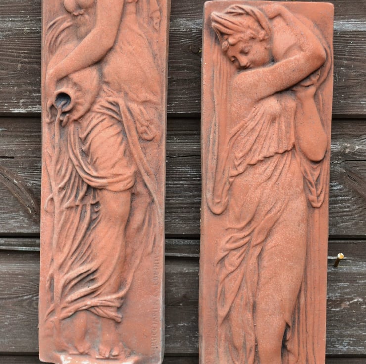Each of our Water Bearers plaques are hand cast at our Sussex workshop in frost proof reconstituted stone with an aged terracotta, white or sandstone colour finish.