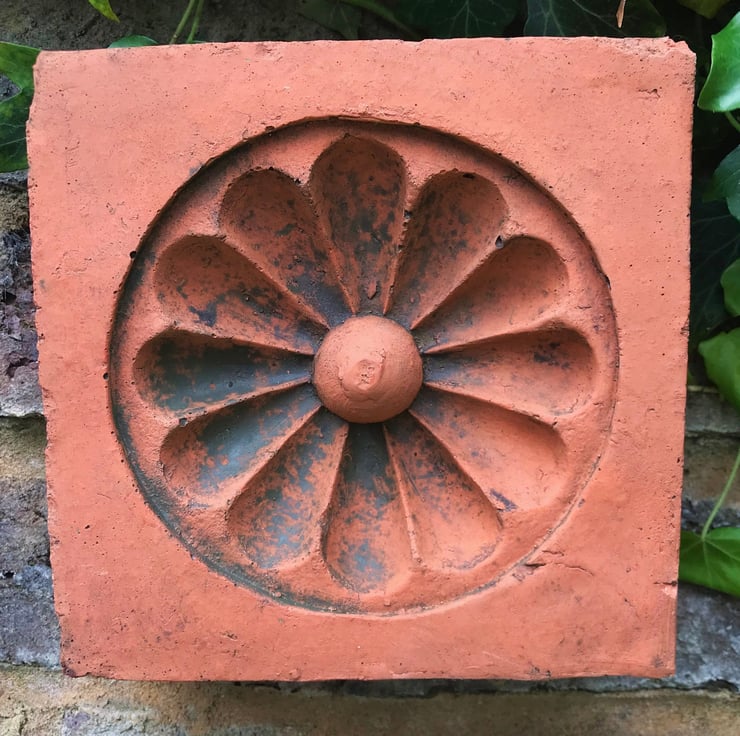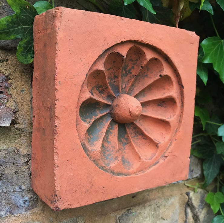 Copy of an antique decorative brick, usually found on period buildings as an architectural detail, hand cast at our workshops in Sussex in frost proof reconstituted stone in aged terracotta colour