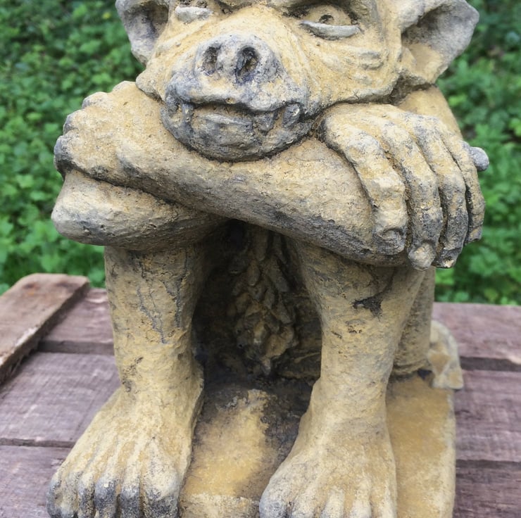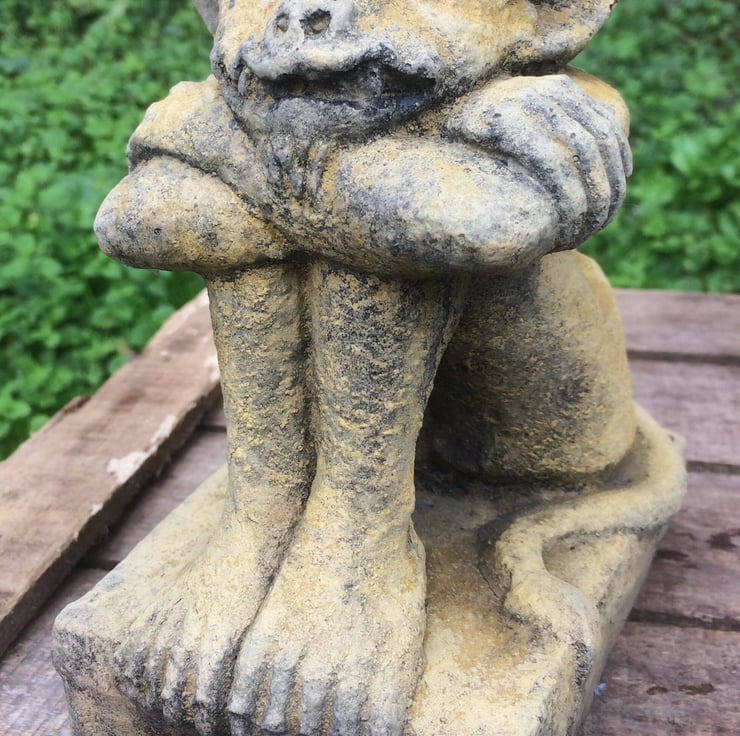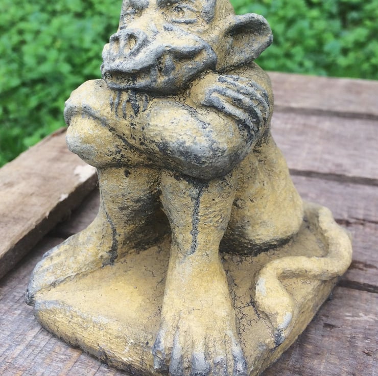 Each of our Gremlin Family statues are hand cast at our Sussex workshop in frost proof reconstituted stone with an aged sandstone colour finish.